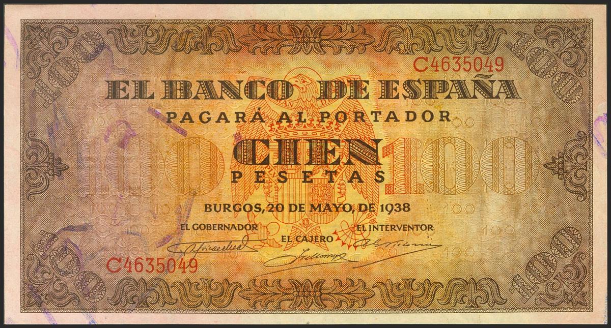 100 pesetas. May 20, 1938. Series C. (Edifil 2021: 432a, Pick: 113). Unusual in this quality, it retains all its original size, natural wrinkles of the paper without any importance. Almost Uncirculated.