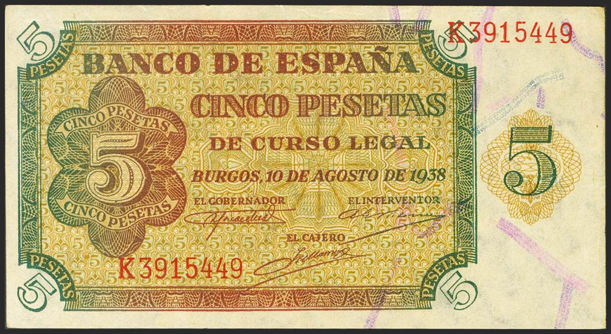 5 pesetas. August 10, 1938. Series K. (Edifil 2021: 435a). original sizing Almost Uncirculated.