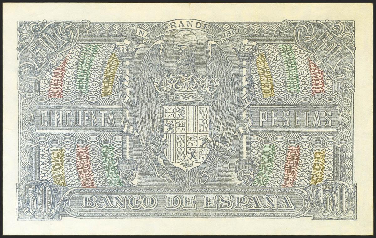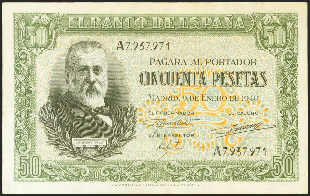 50 pesetas. January 9, 1940. Series A. (Edifil 2021: 437). It retains part of its original size. Extremely Fine.