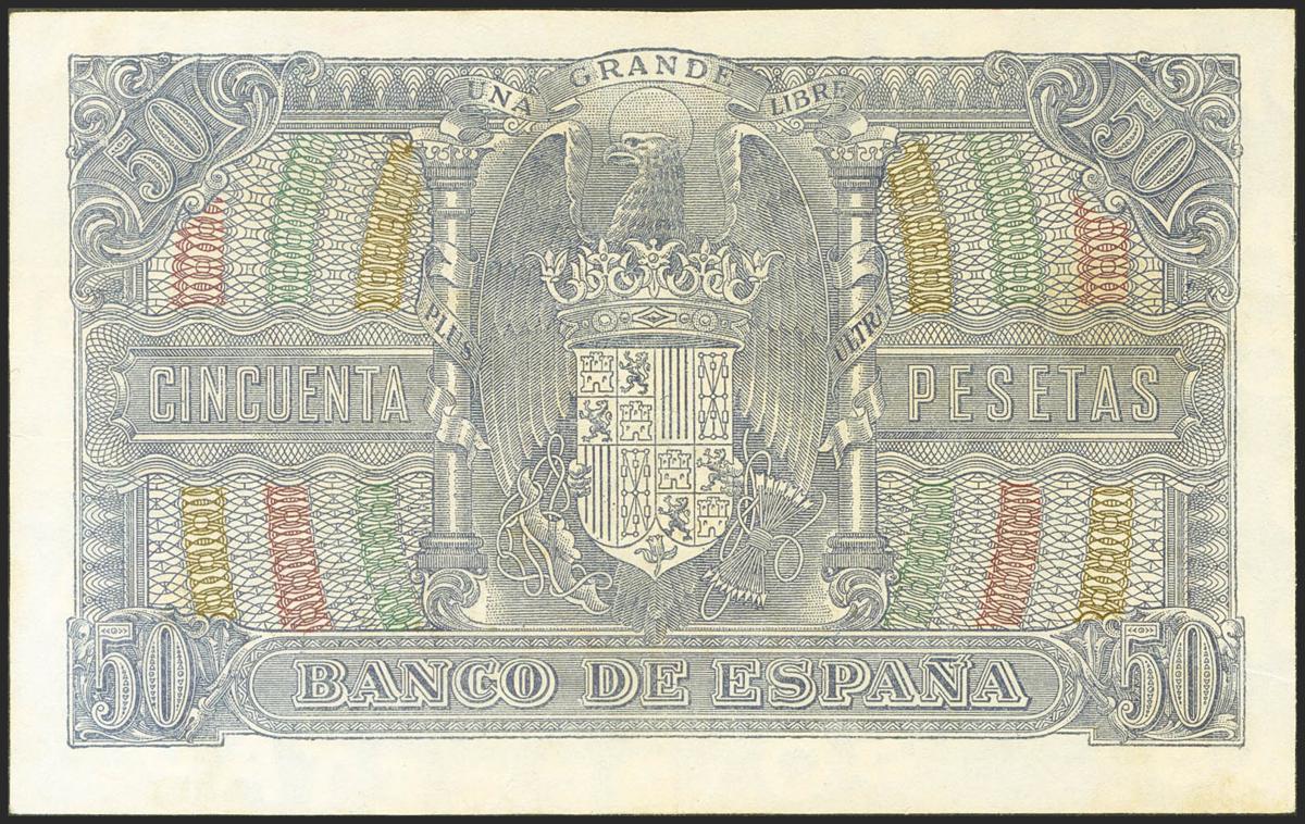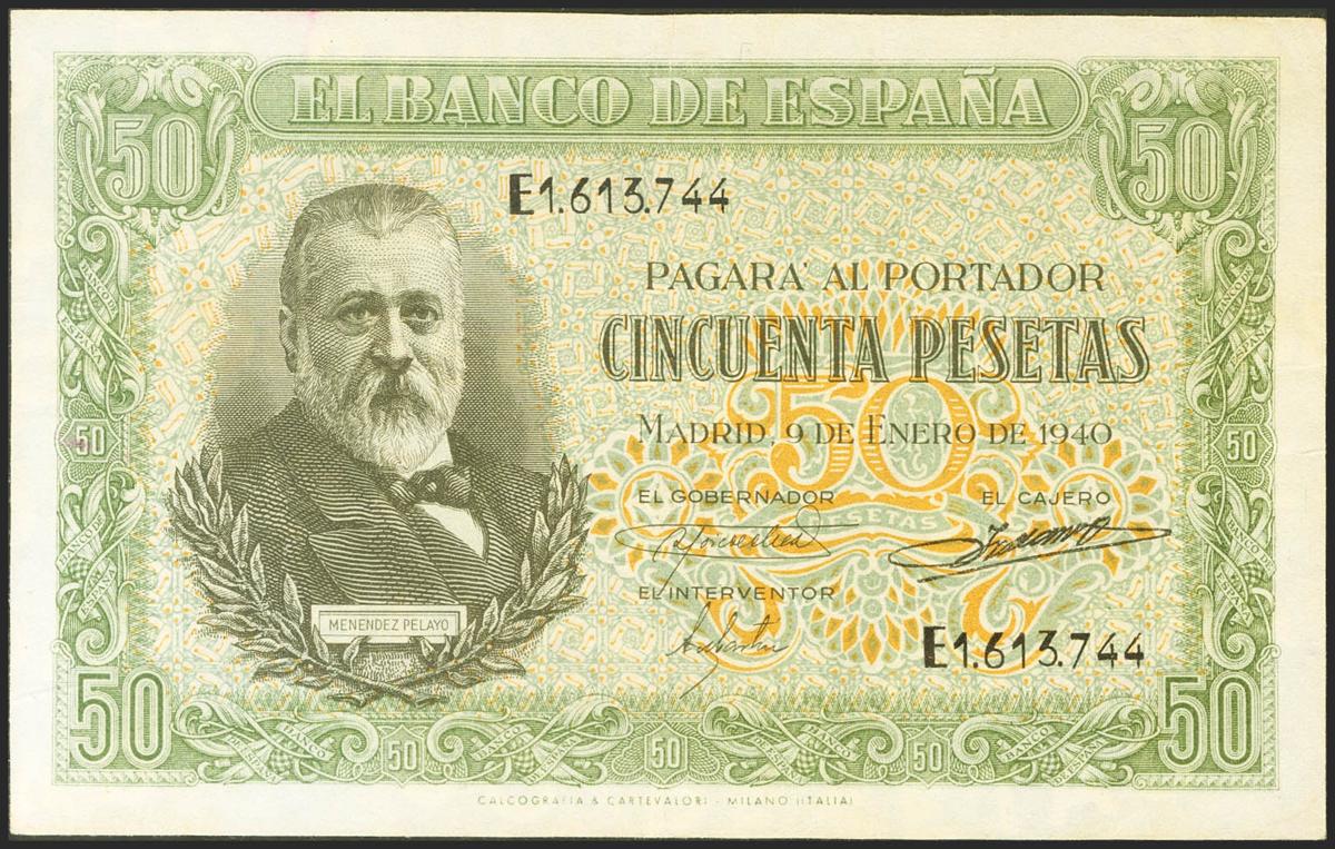 50 pesetas. January 9, 1940. Series E. (Edifil 2021: 437a). It retains part of its original size. Good Very Fine.
