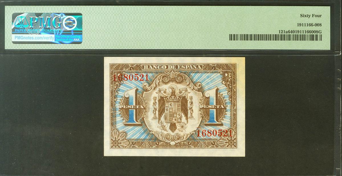1 peseta. June 1, 1940. No series. (Edifil 2021: 441, Pick: 121a). Unusual. Uncirculated. PMG64 encapsulation.