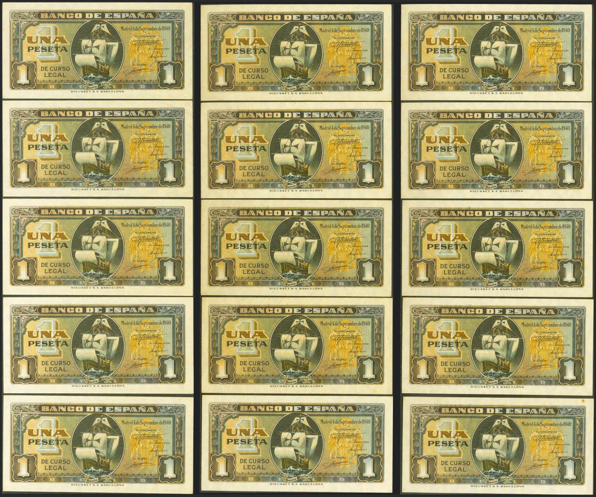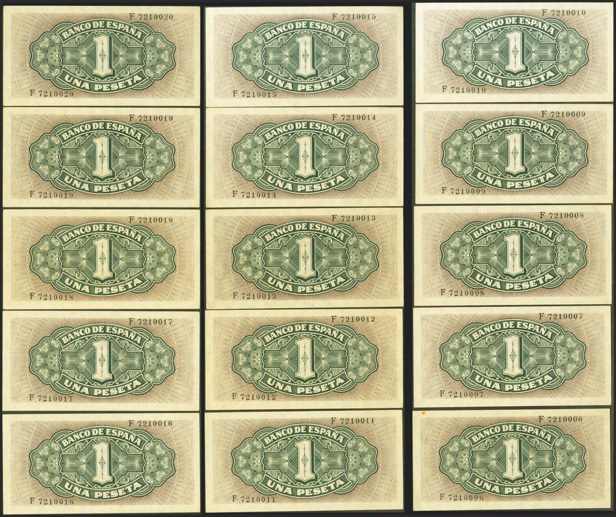 Set of 15 correlative banknotes of 1 Peseta issued on September 4, 1940 with the F series (Edifil 2021: 442a), preserving its original size. Uncirculated/ Good Extremely Fine.