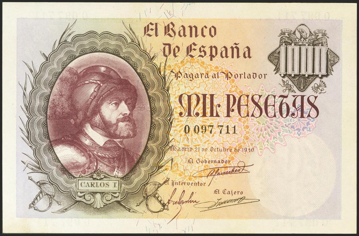 1000 pesetas. October 21, 1940. Without series and with low numbering. (Edifil 2021: 445, Pick: 125a). Very rare in this quality, retaining much of its original sizing. Extremely Fine.