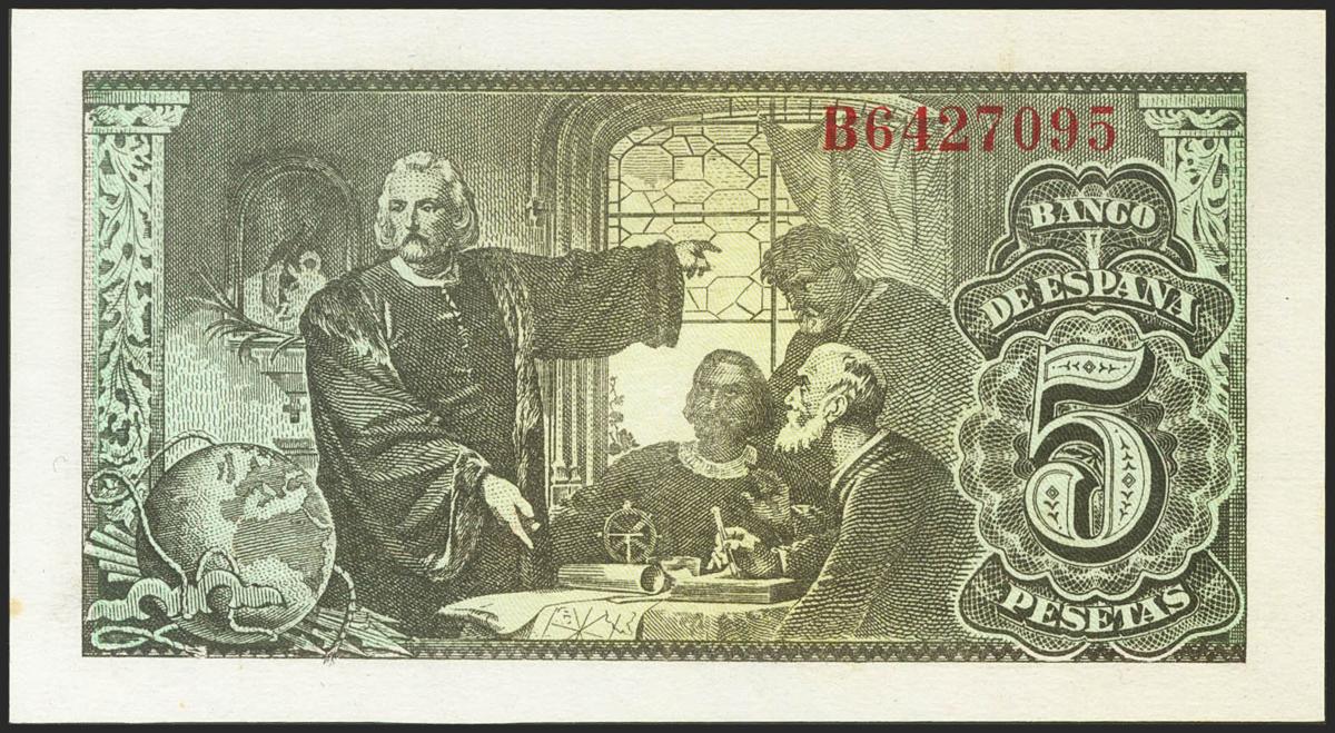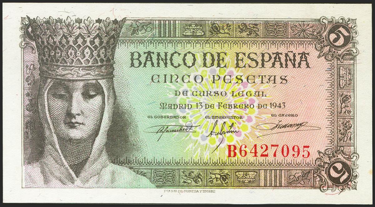 5 pesetas. February 13, 1943. Series B. (Edifil 2021: 446a). It retains part of its original size. Extremely Fine.