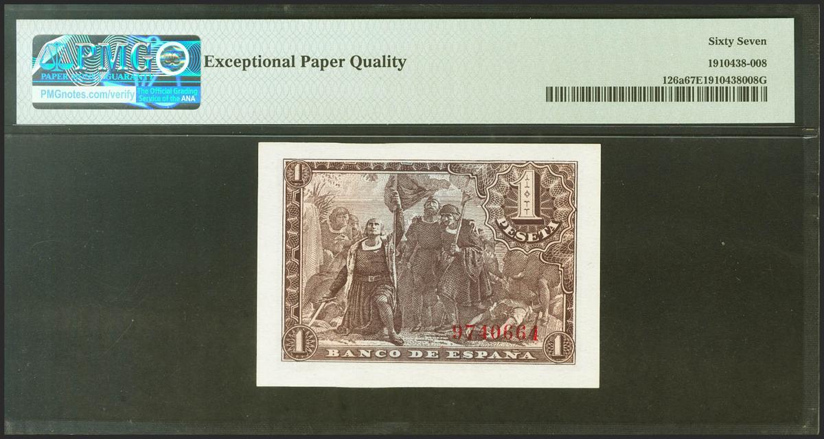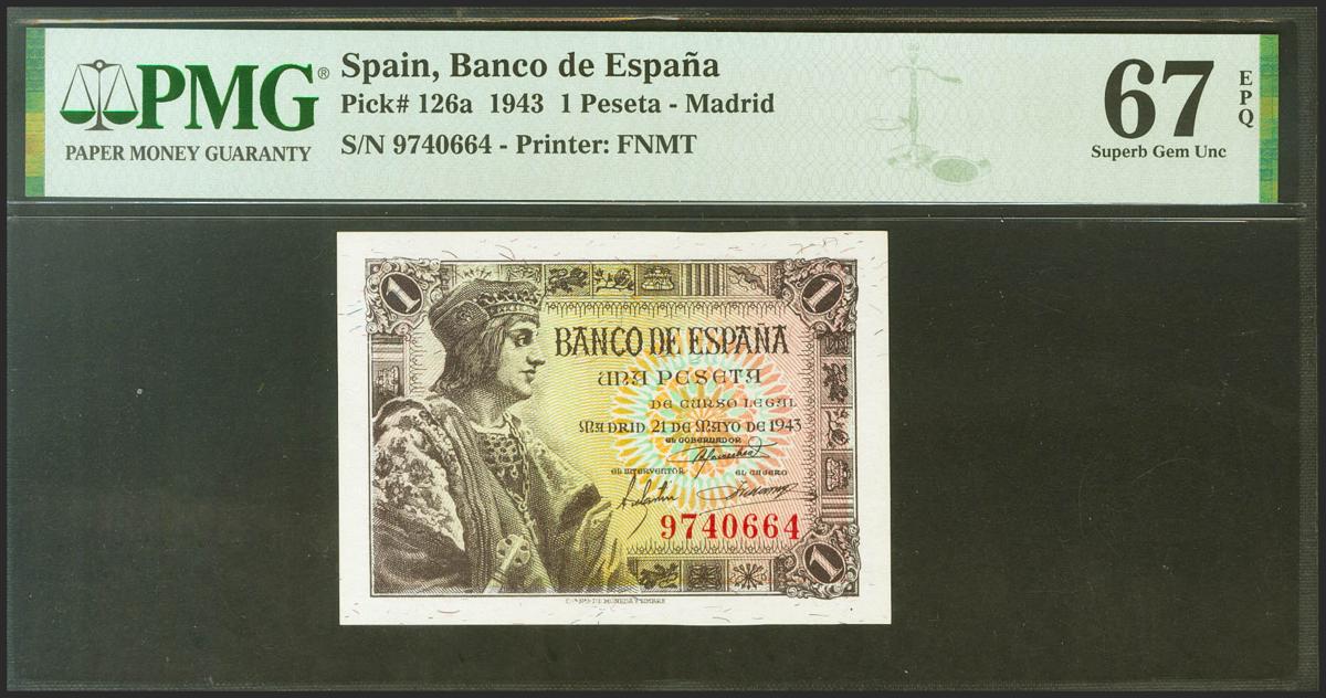 1 peseta. May 21, 1943. No series. (Edifil 2021: 447, Pick: 126a). Rare in this exceptional quality, original sizing. Uncirculated. PMG67EPQ package.