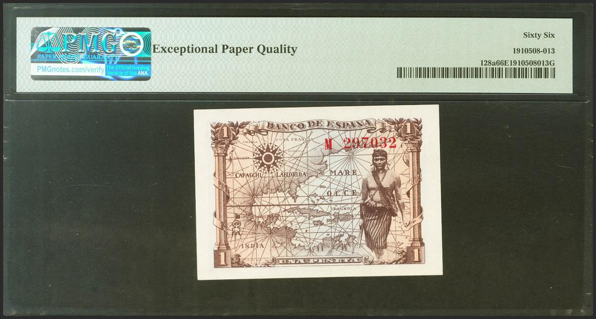 1 peseta. June 15, 1945. Series M, last series issued. (Edifil 2017: 448a, Pick: 128a). original sizing Uncirculated. PMG66EPQ package.