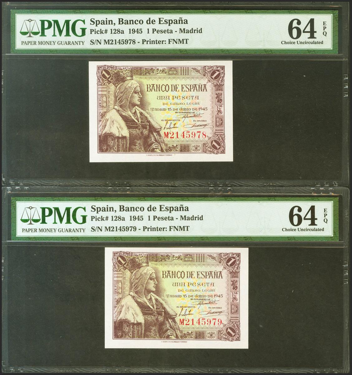 1 peseta. June 15, 1945. Correlative couple. Series M, last series issued. (Edifil 2017: 448a, Pick: 128a). original sizing Uncirculated. PMG64EPQ package.
