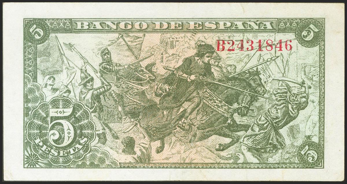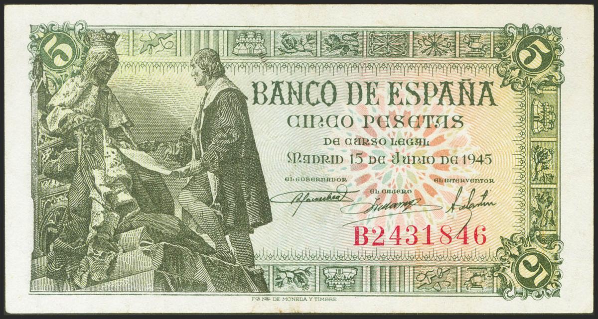 5 pesetas. June 15, 1945. Series B. (Edifil 2021: 449a). Very Fine.