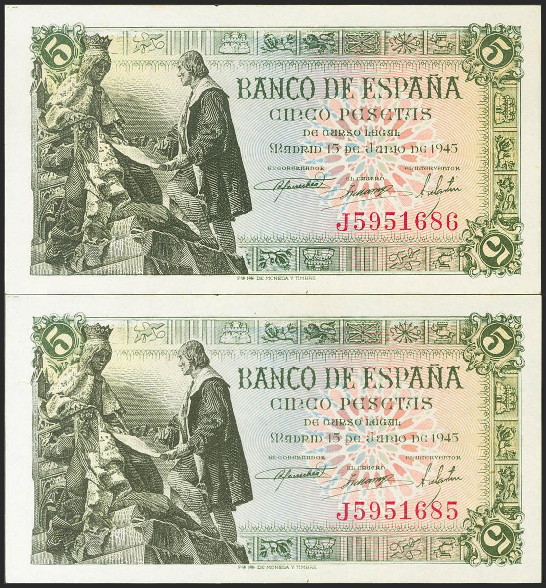 5 pesetas. July 15, 1945. Correlative couple. Series J. (Edifil 2021: 449a). original sizing Uncirculated.
