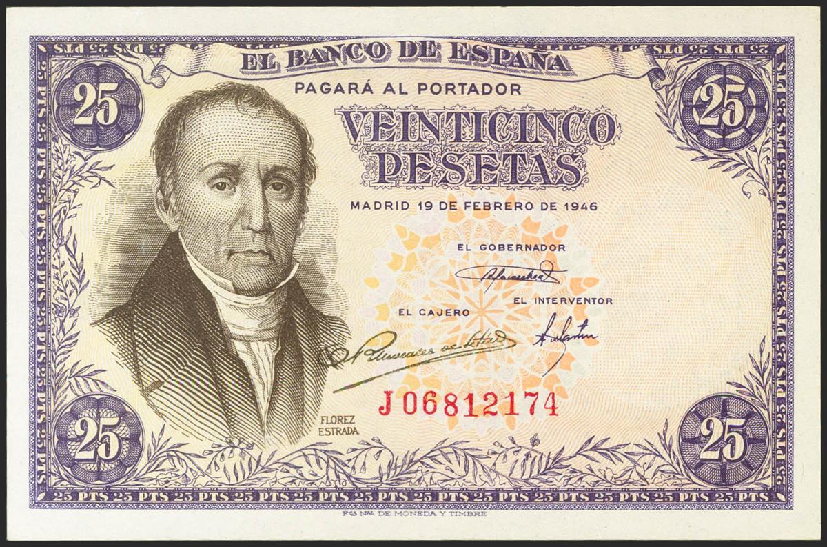 25 pesetas. February 19, 1946. Series J. (Edifil 2021: 450a). It retains some of its original sizing. Almost Uncirculated.