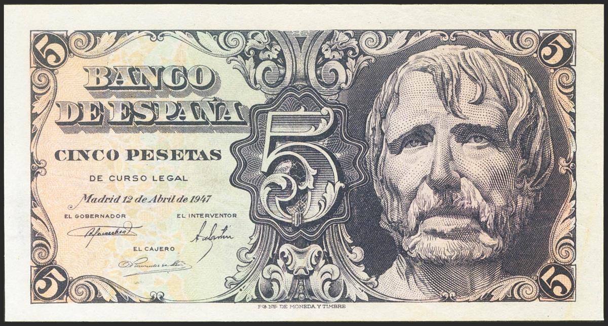 5 pesetas. April 12, 1947. Series A. (Edifil 2021: 454a). It retains part of its original size. Extremely Fine.