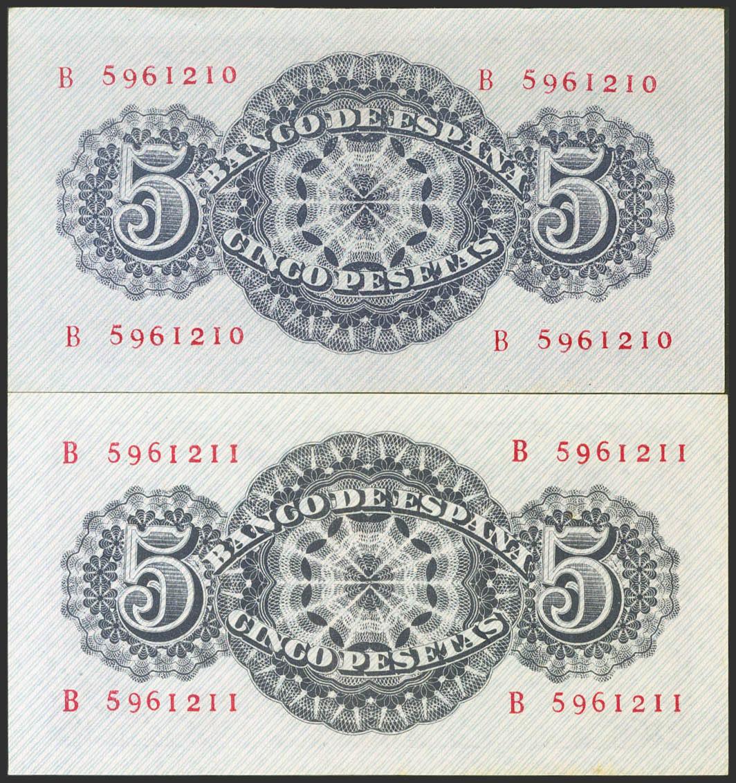 5 pesetas. April 12, 1947. Correlative couple. Series B. (Edifil 2021: 454a). original sizing Good Extremely Fine.