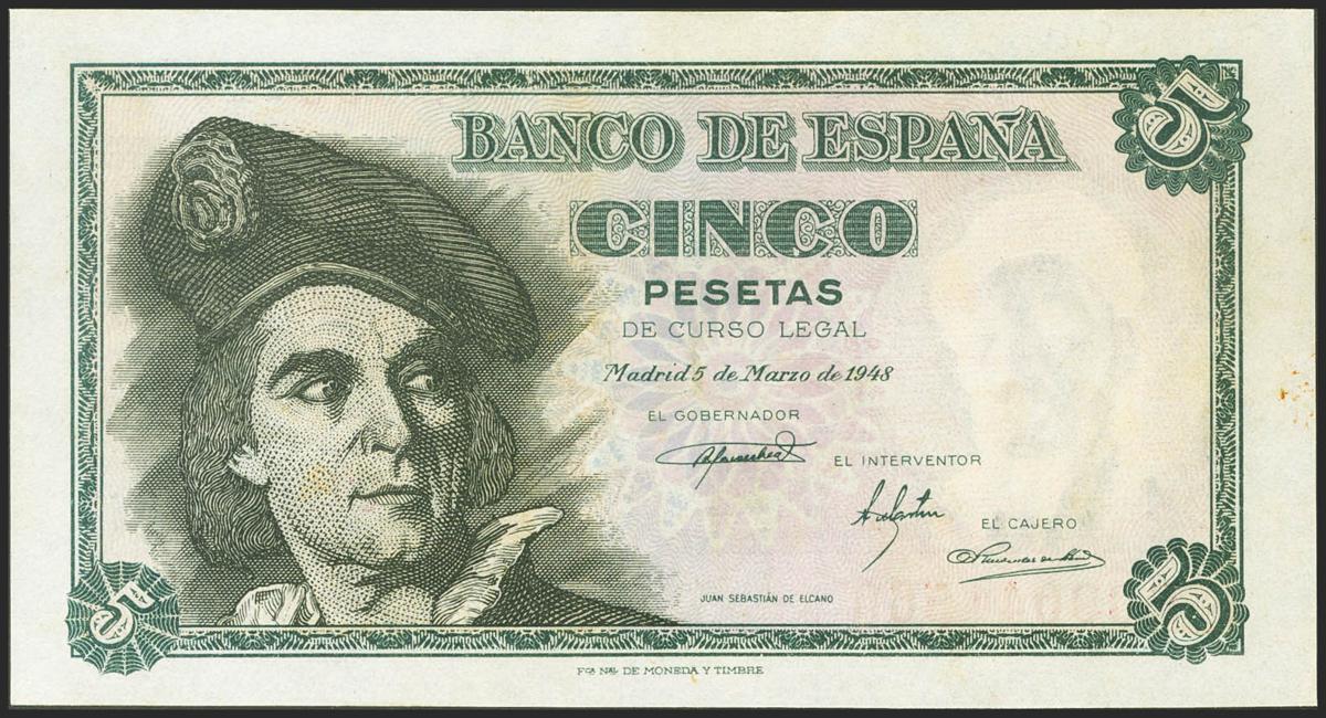 5 pesetas. March 5, 1948. Series E. (Edifil 2021: 455a). original sizing Good Extremely Fine.