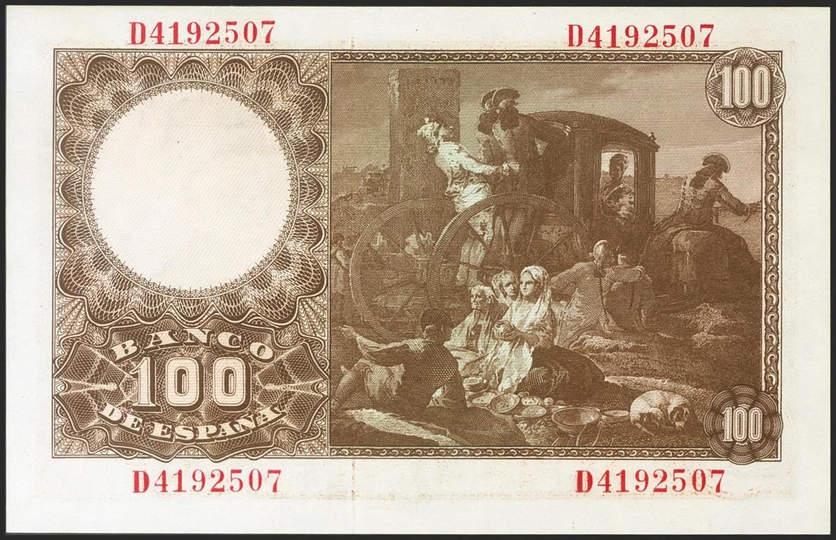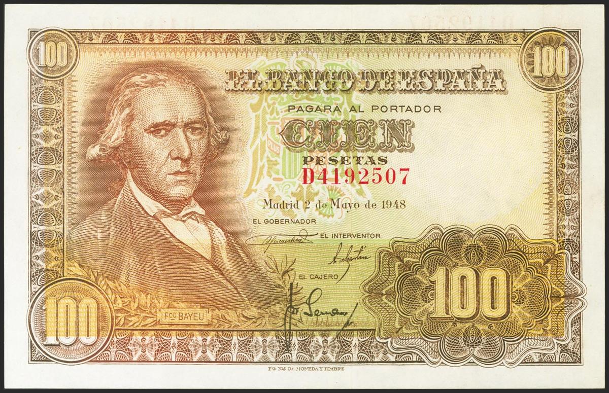 English 100 pesetas. May 2, 1948. Series D. (Edifil 2021: 456a, Pick: 137a). Rare in this superlative quality, it retains all its original sizing. Uncirculated.