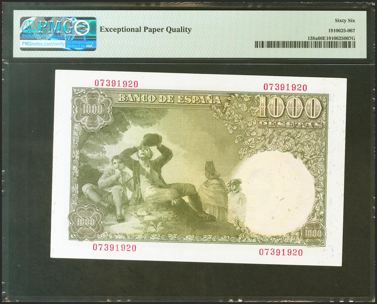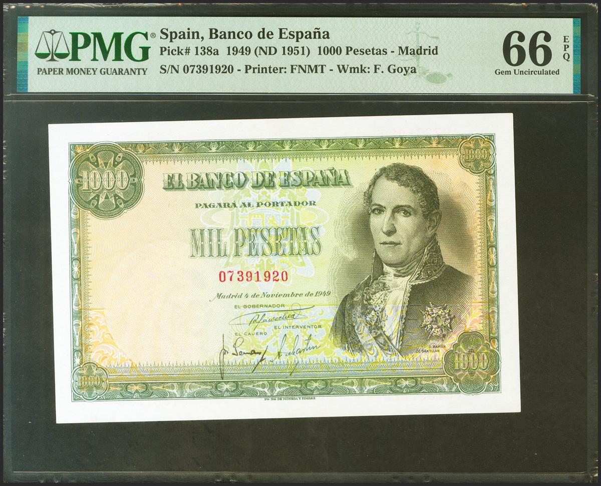 1000 pesetas. November 4, 1949. No series. (Edifil 2021: 458, Pick: 138a). Very rare in this exceptional quality, original sizing. Uncirculated. PMG66EPQ package. (To give us an idea of its rarity, as of July 1, 2022, this bill is the best rated along with 7 other bills in PMG)