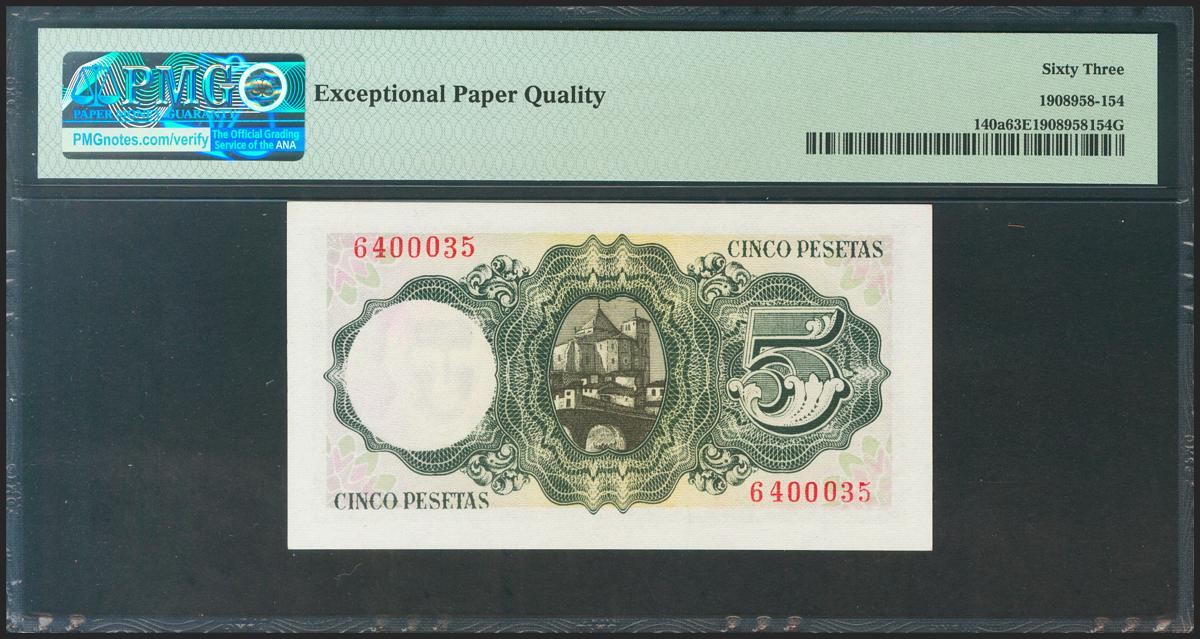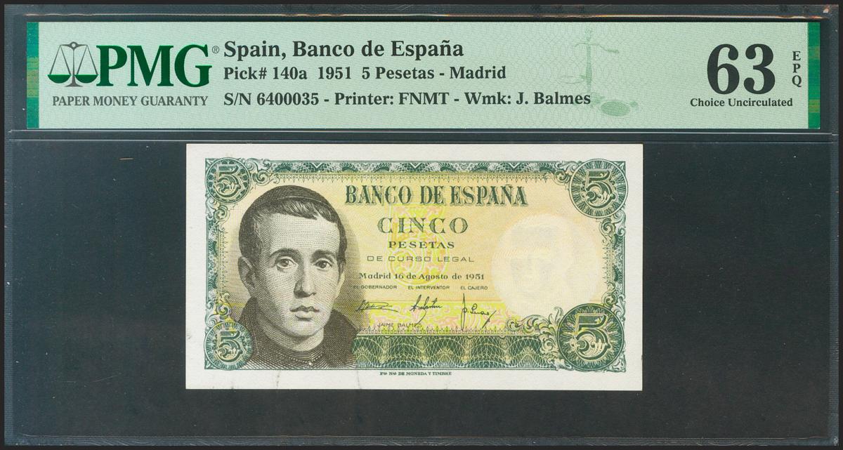 5 pesetas. August 16, 1951. No series. (Edifil 2021: 459, Pick: 140a). original sizing Uncirculated. PMG63EPQ package.