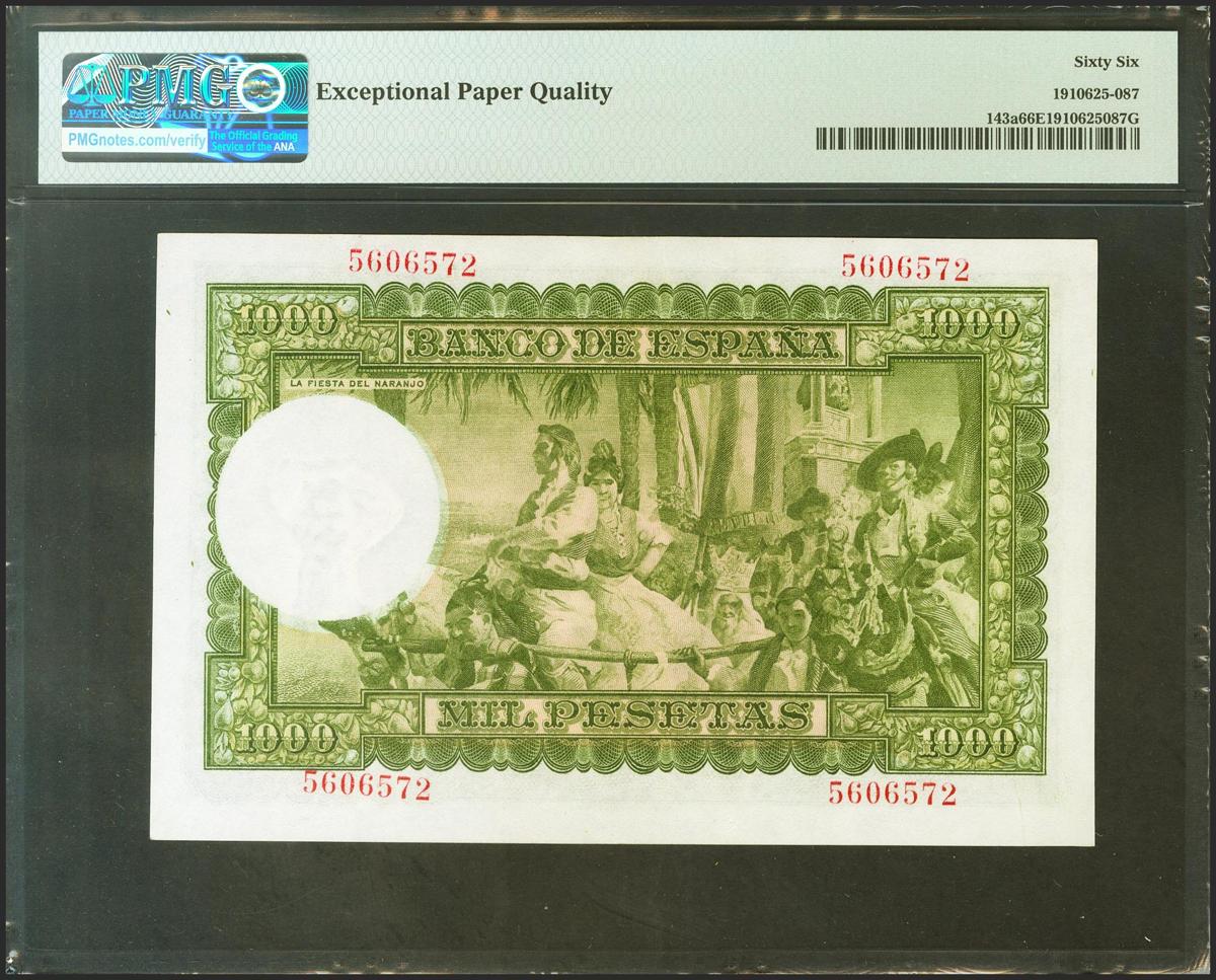 1000 pesetas. December 31, 1951. No series. (Edifil 2021: 463, Pick: 143a). Rare in this exceptional quality, original sizing. Uncirculated. PMG66EPQ package.