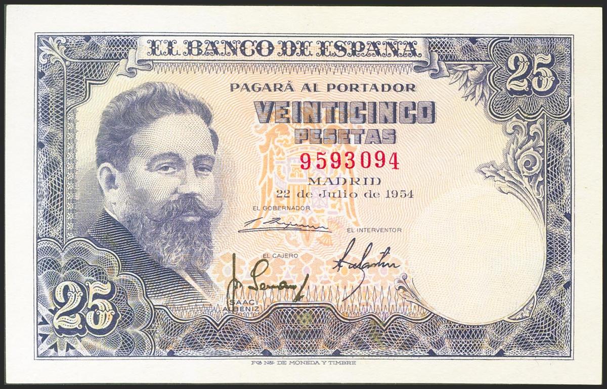 English 25 pesetas. July 22, 1954. No series. (Edifil 2021: 467). Unusual, it retains some of its original sizing. Extremely Fine.