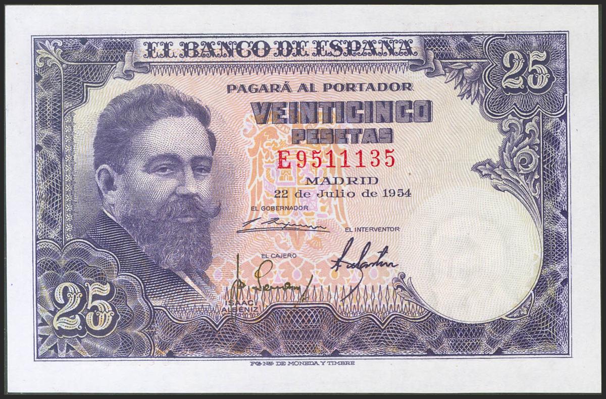 25 pesetas. July 22, 1954. Series E. (Edifil 2021: 467a). It retains all its original sizing. Uncirculated.