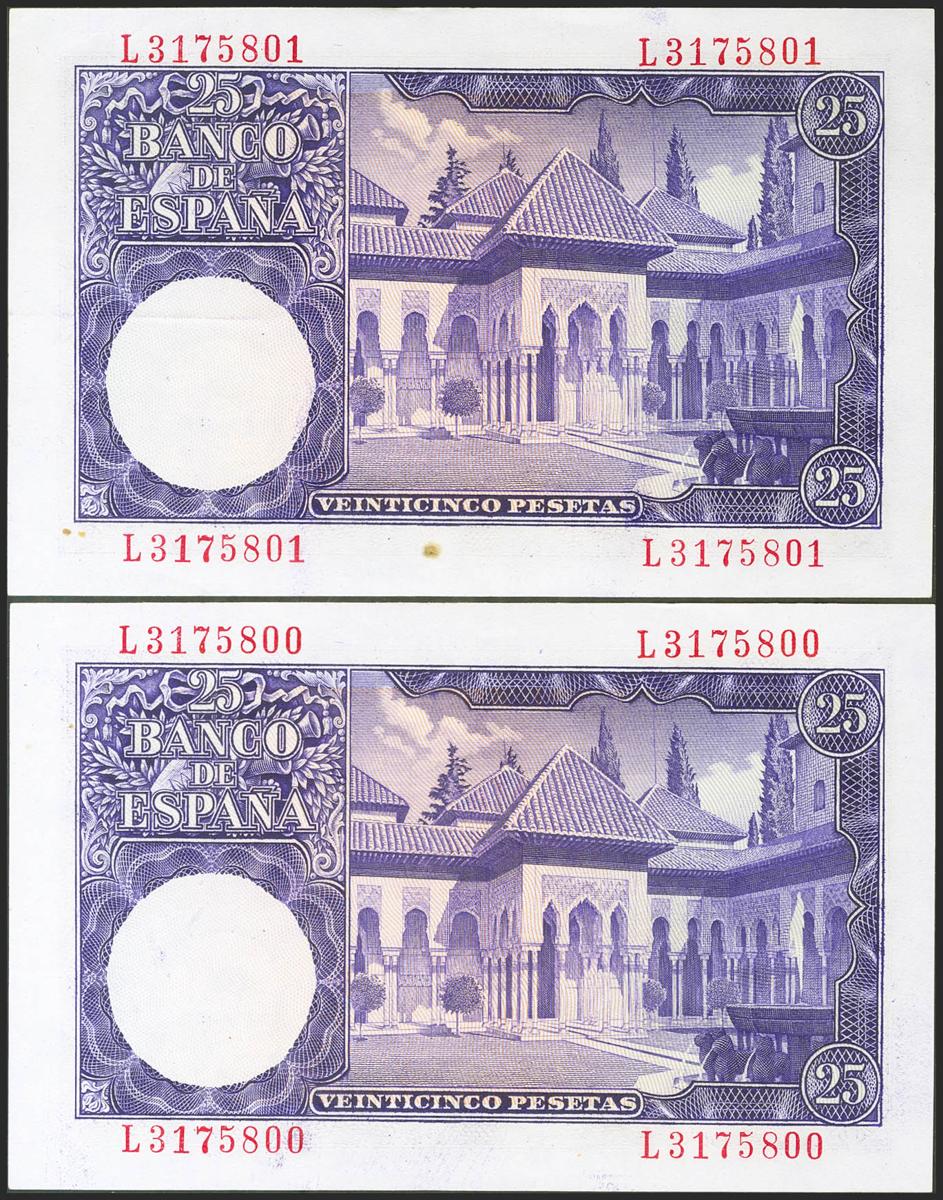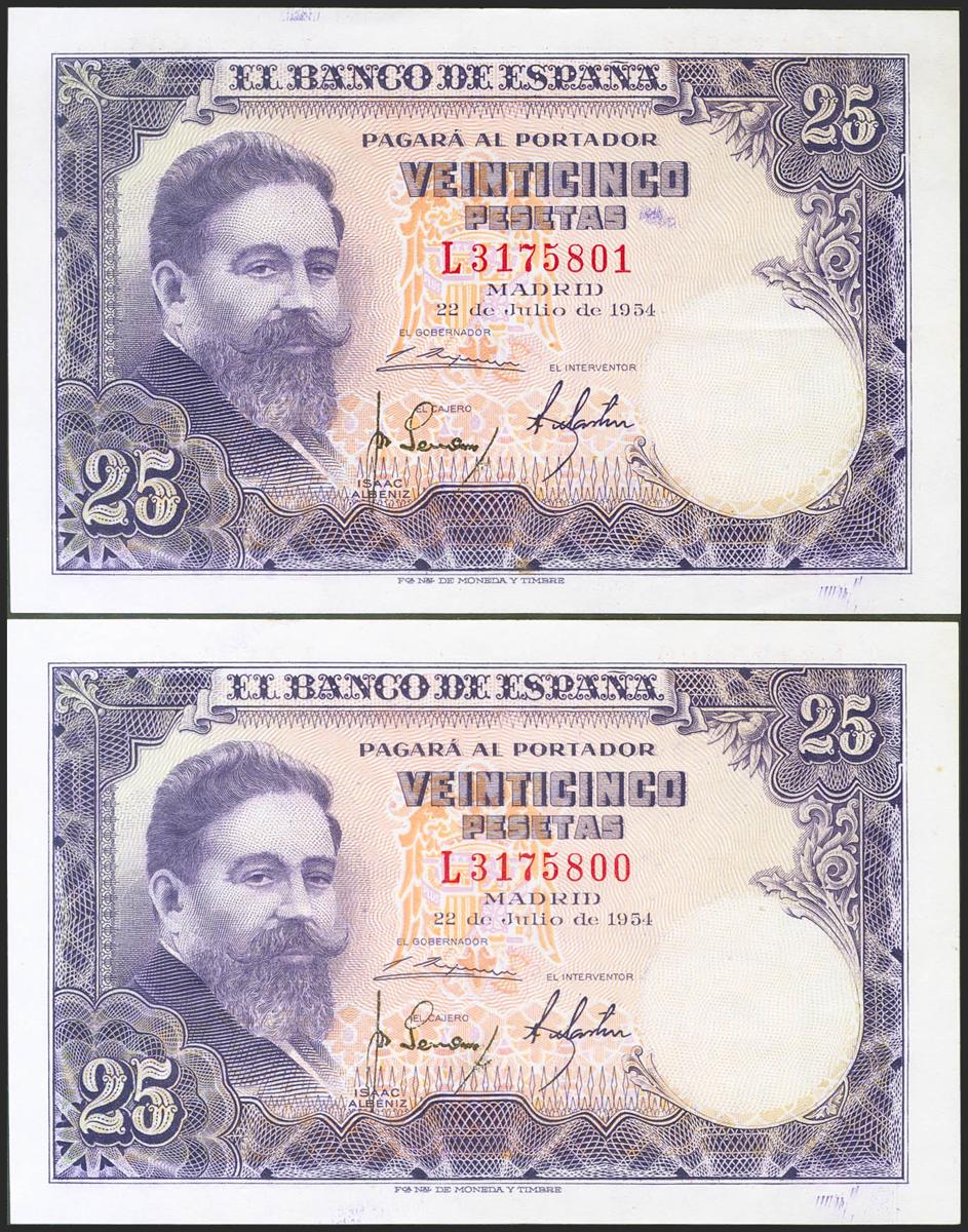 25 pesetas. July 22, 1954. Correlative couple. Series L. (Edifil 2021: 467a). It retains much of its original size. EBC++.