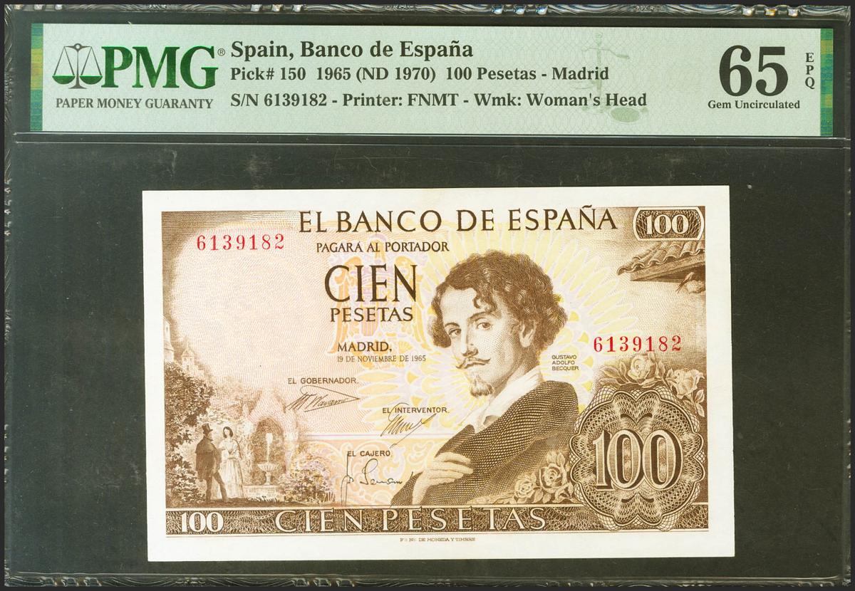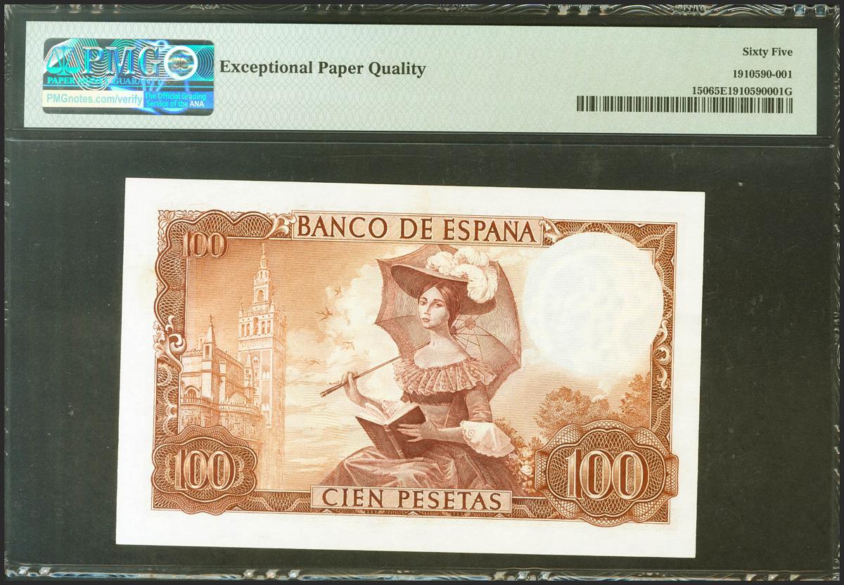 100 pesetas. November 19, 1965. No series. (Edifil 2021: 470, Pick: 150). original sizing PMG65EPQ package.