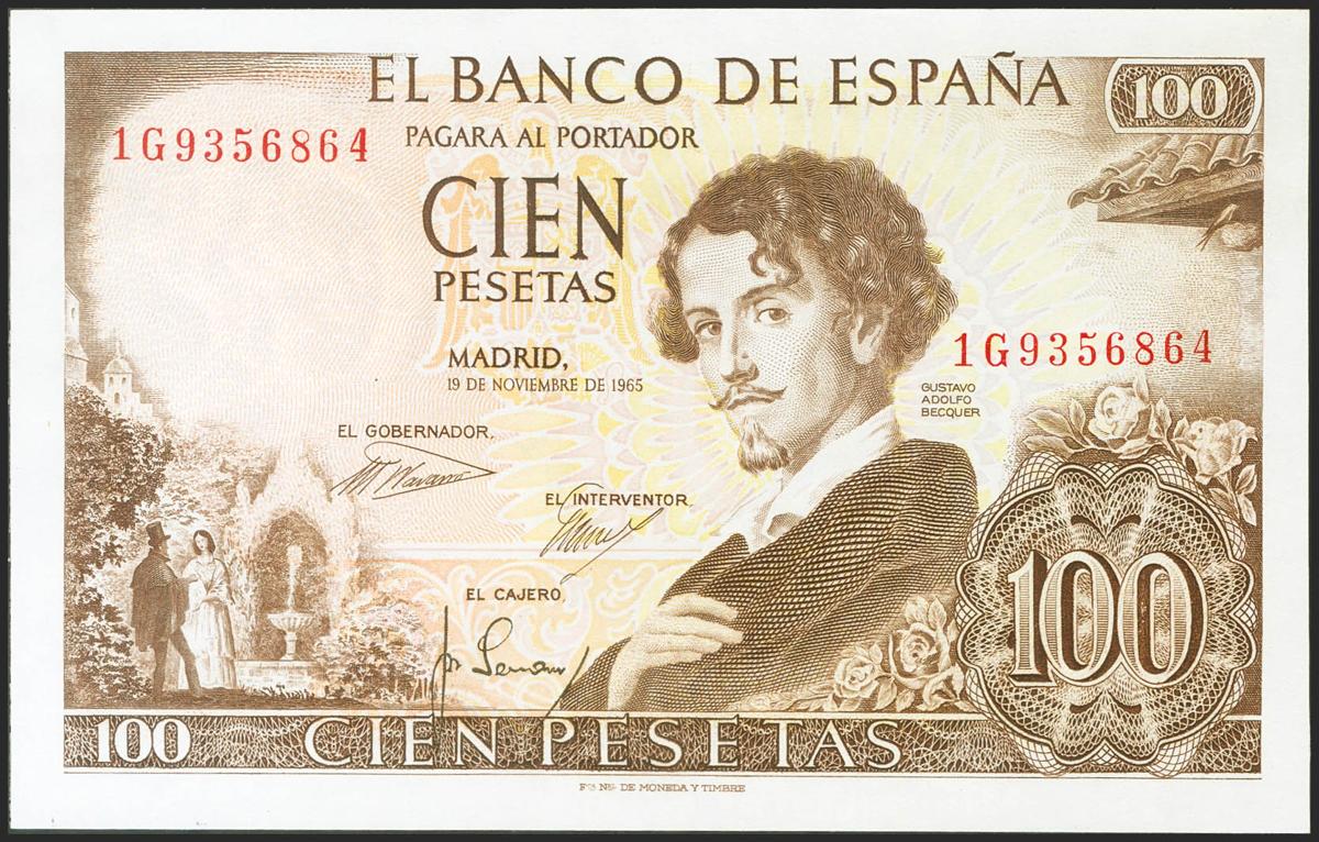 100 pesetas. November 19, 1965. Series 1G. (Edifil 2021: 470a). original sizing Uncirculated.