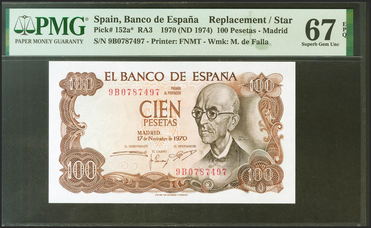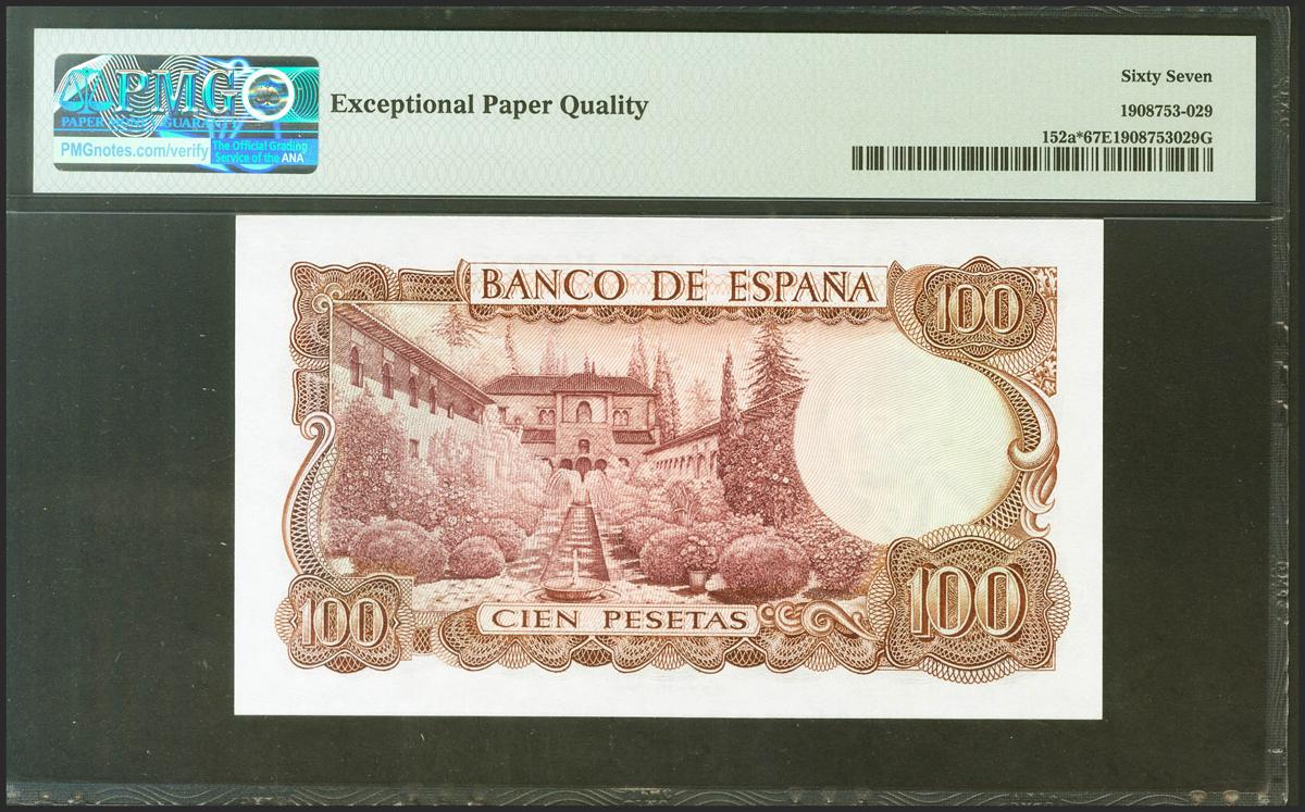 100 pesetas. November 17, 1970. Special series 9B. (Edifil 2021: 472d, Pick: 152a*). Rare in this exceptional quality, original sizing. Uncirculated. PMG67EPQ package.