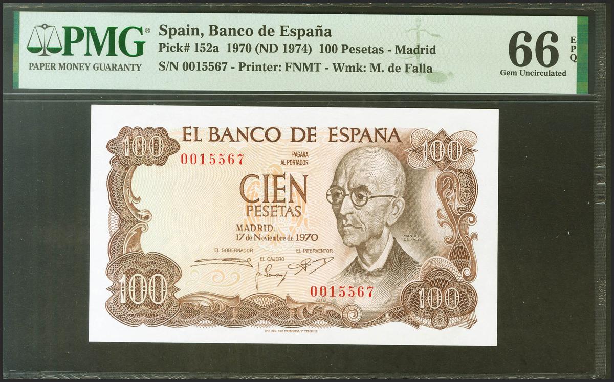 100 pesetas. November 17, 1970. Without series and very low numbering. (Edifil 2021: 472, Pick: 152a). Rare in this exceptional quality, original sizing. Uncirculated. PMG66EPQ package.