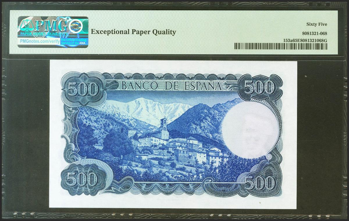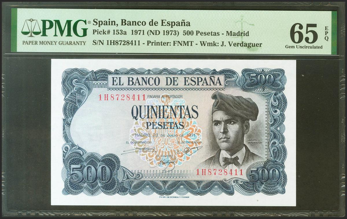 500 pesetas. July 23, 1971. Series 1H. (Edifil 2021: 473a, Pick: 153a). Rare in this exceptional quality. Uncirculated. PMG65EPQ package.