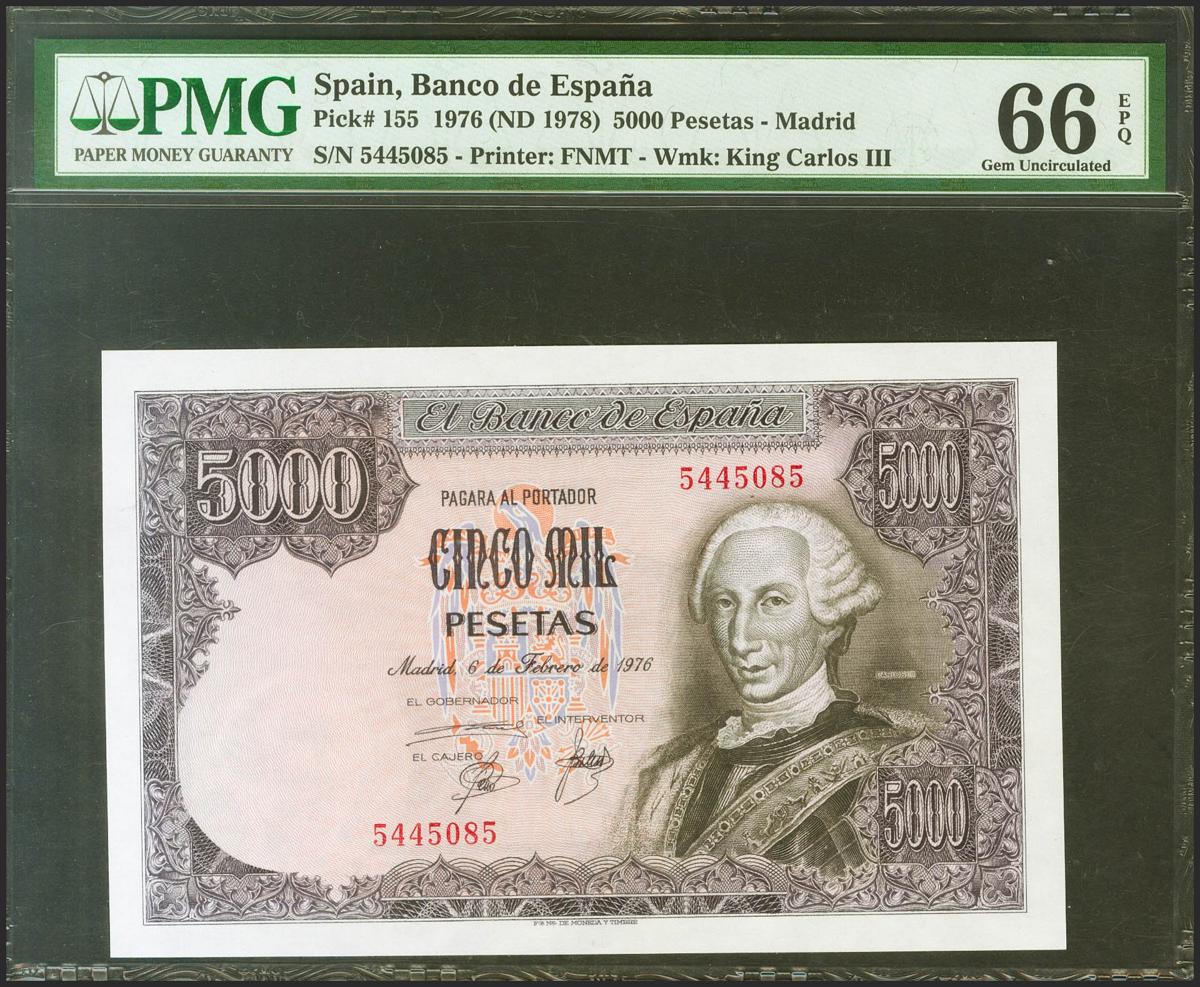 English 5000 pesetas. February 6, 1976. No series. (Edifil 2021: 475, Pick: 155). Rare in this exceptional quality, original sizing. Uncirculated. PMG66EPQ package.