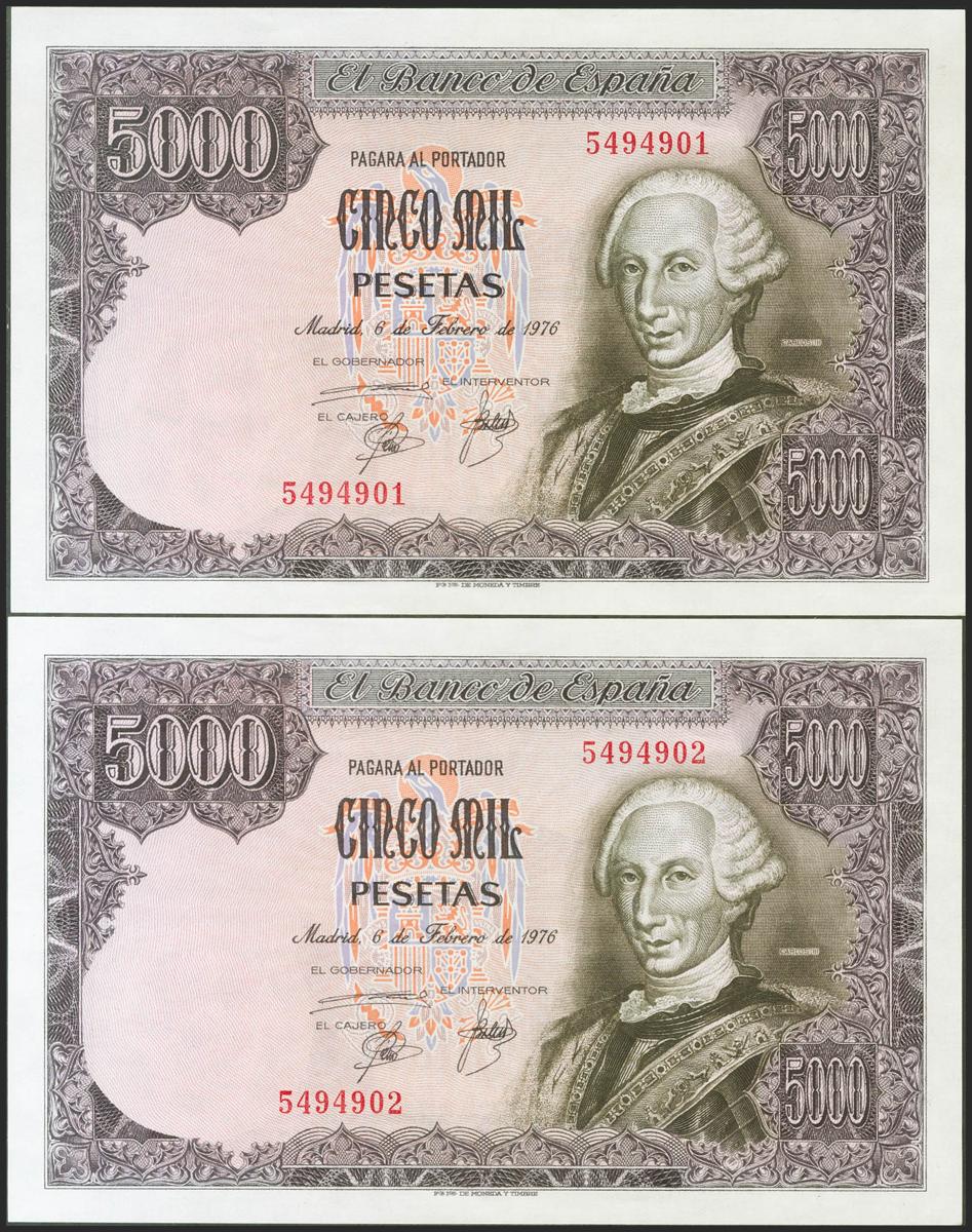 5000 pesetas. February 6, 1976. Correlative couple. No serie. (Edifil 2021: 475). original sizing EBC+++.