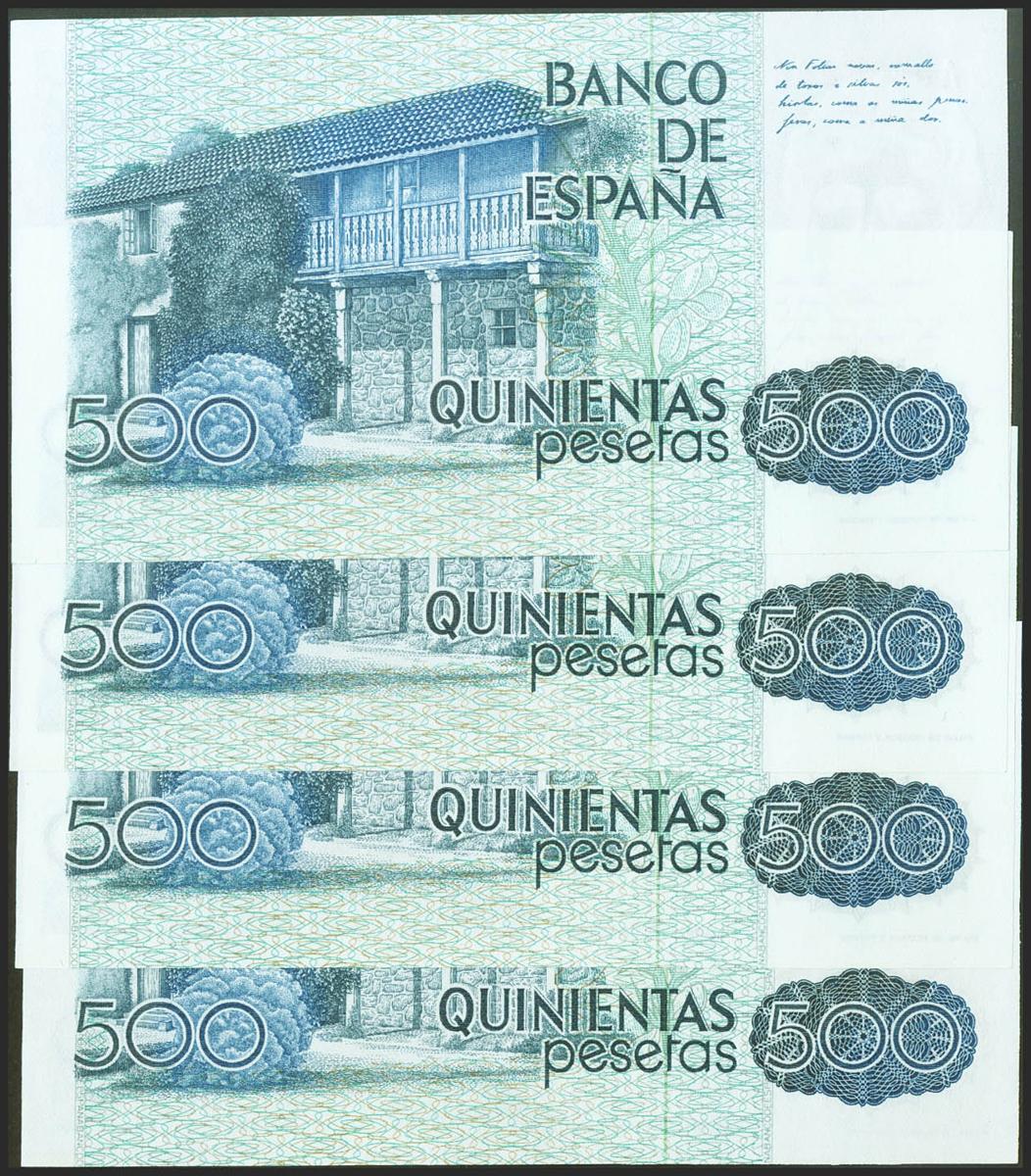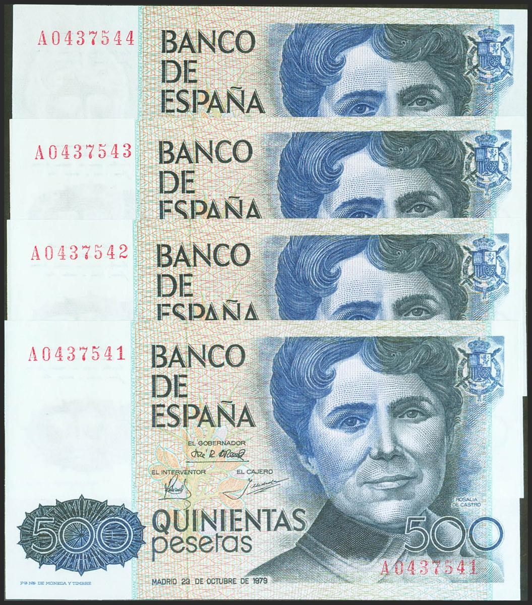 Set of 4 correlative banknotes of 500 Pesetas issued on October 23, 1979 with series A. (Edifil 2017: 476a). Uncirculated.