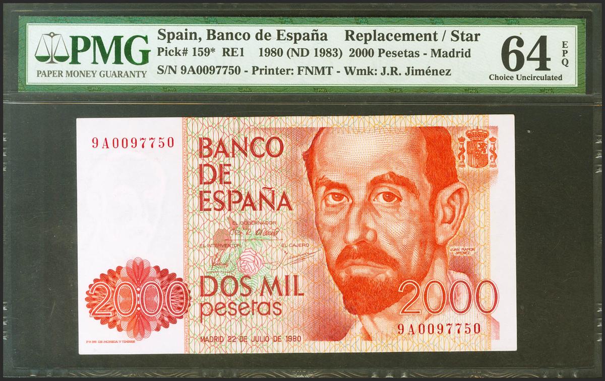 2000 pesetas. July 22, 1980. Special series 9A. (Edifil 2021: 479b, Pick: 159*). original sizing Uncirculated. PMG64EPQ package.