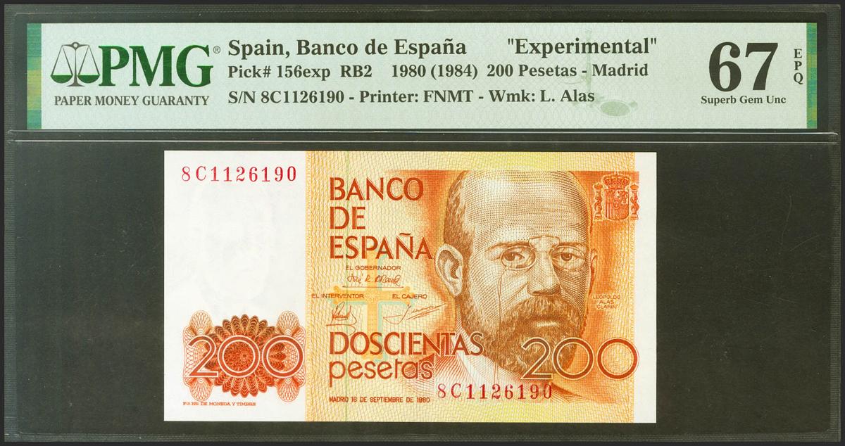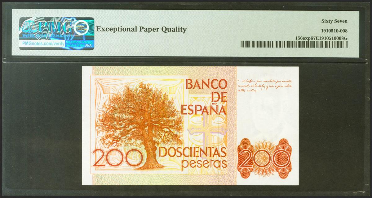 200 pesetas. September 16, 1980. Special series 8C. (Edifil 2021: 480c, Pick: 156exp). Very rare in this exceptional quality, original sizing. Uncirculated. PMG67EPQ package.