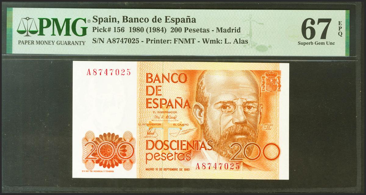 200 pesetas. September 16, 1980. Series A. (Edifil 2021: 480a, Pick: 156). original sizing Uncirculated. PMG67EPQ package.