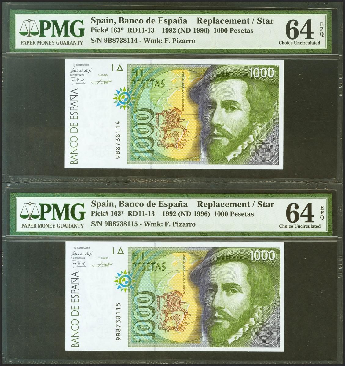 1000 pesetas. October 12, 1992. Correlative couple. Special series 9B. (Edifil 2021: 483d, Pick: 163*). original sizing Uncirculated. PMG64EPQ packages, both.