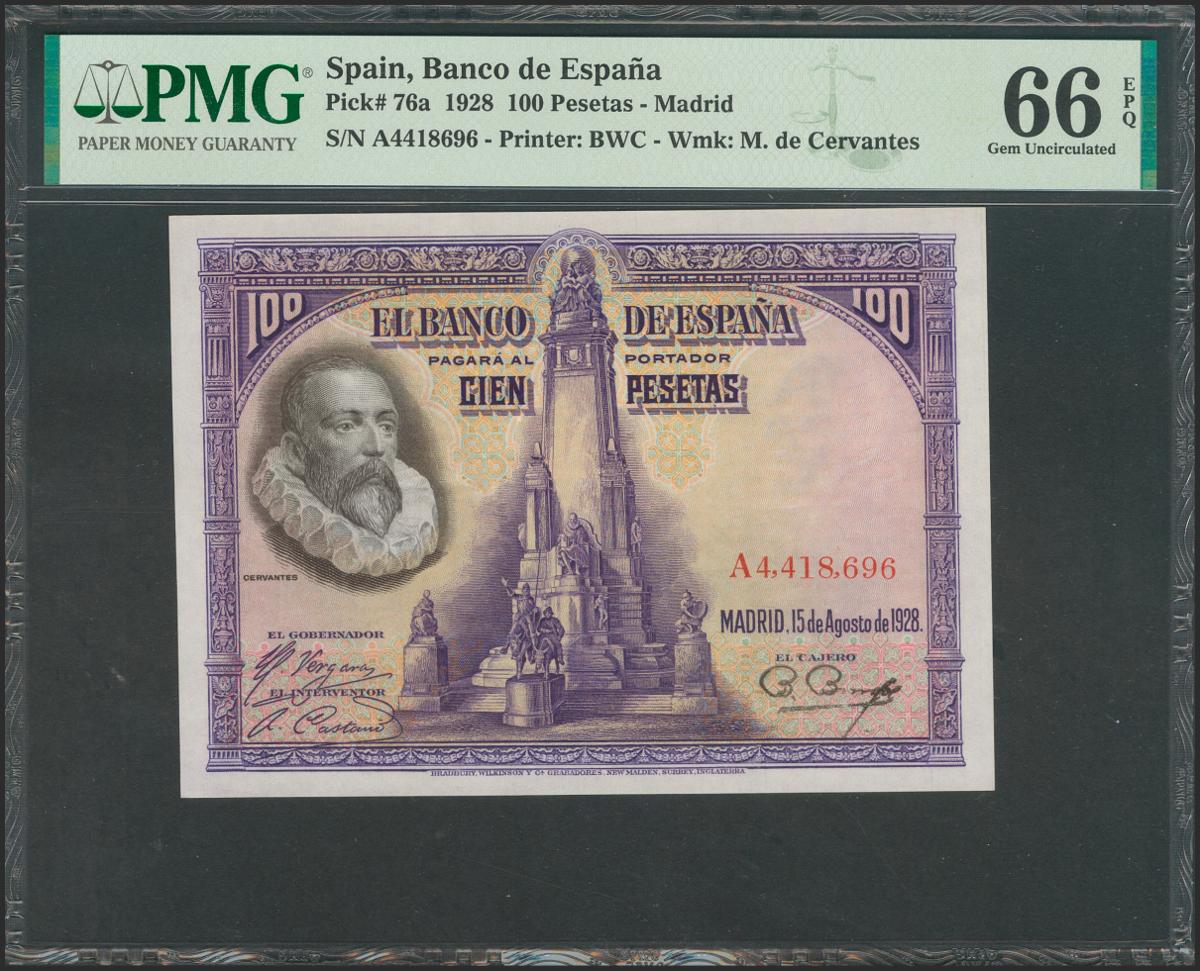 100 pesetas. August 15, 1928. Series A. (Edifil 2017: 355a). original sizing Uncirculated. PMG66EPQ package.