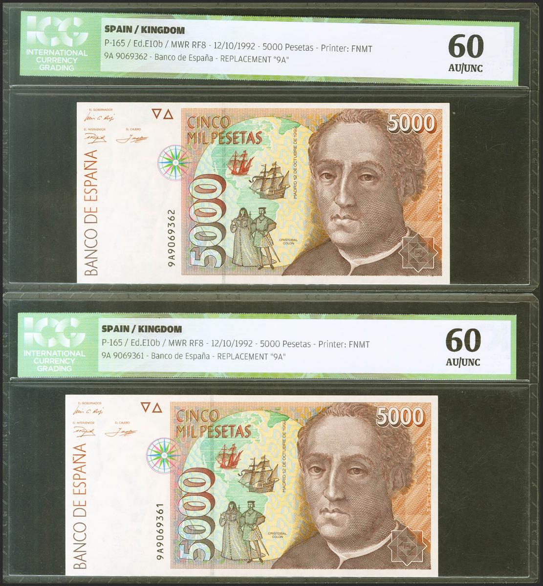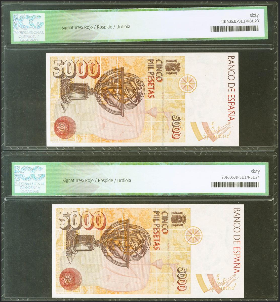 5000 pesetas. October 12, 1992. Correlative couple. Special series 9A. (Edifil 2020: 484b, Pick: 165). ICG60 packages, both. Uncirculated.