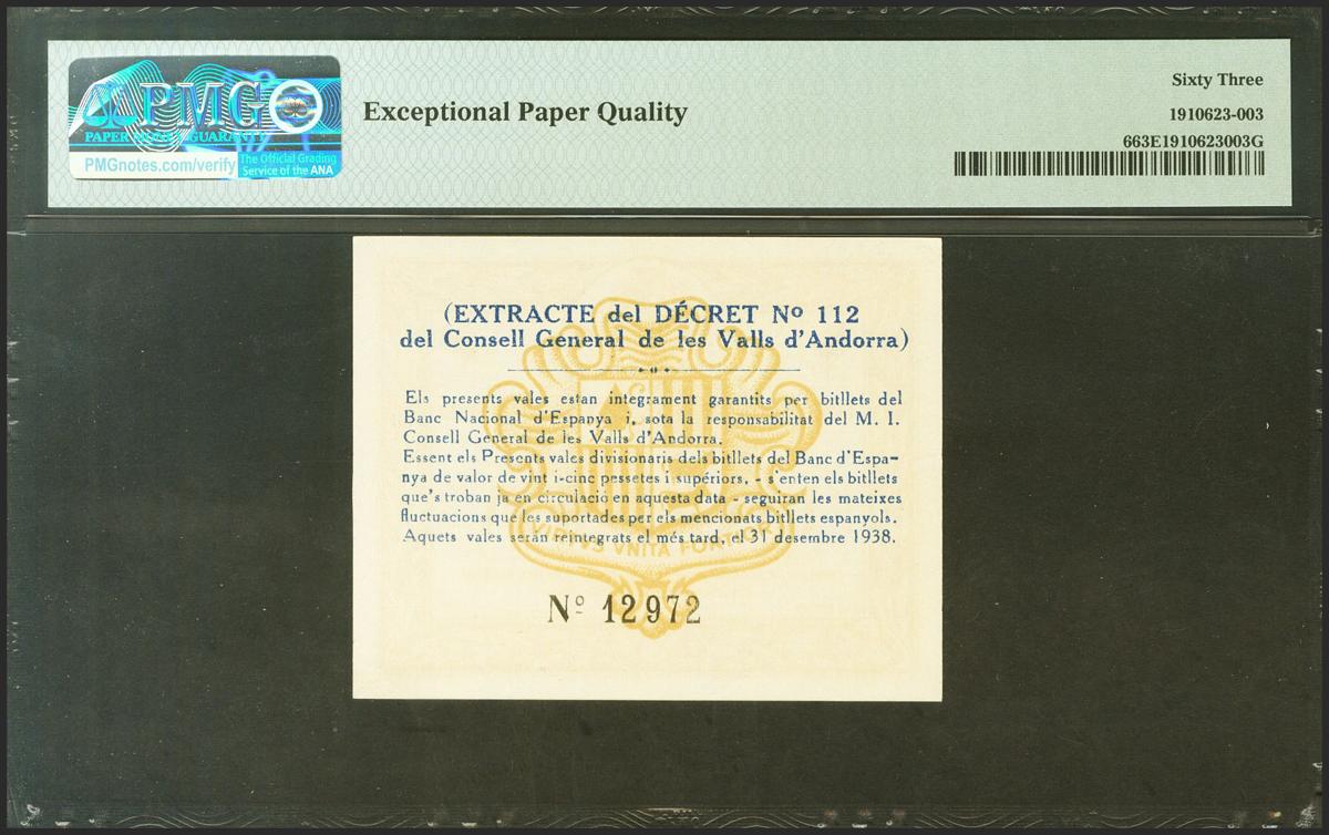 ANDORRA. 1 peseta. December 19, 1936. No series. (Edifil 2021: 3, Pick: 6). Rare, especially in this exceptional quality, original sizing. PMG63EPQ package.