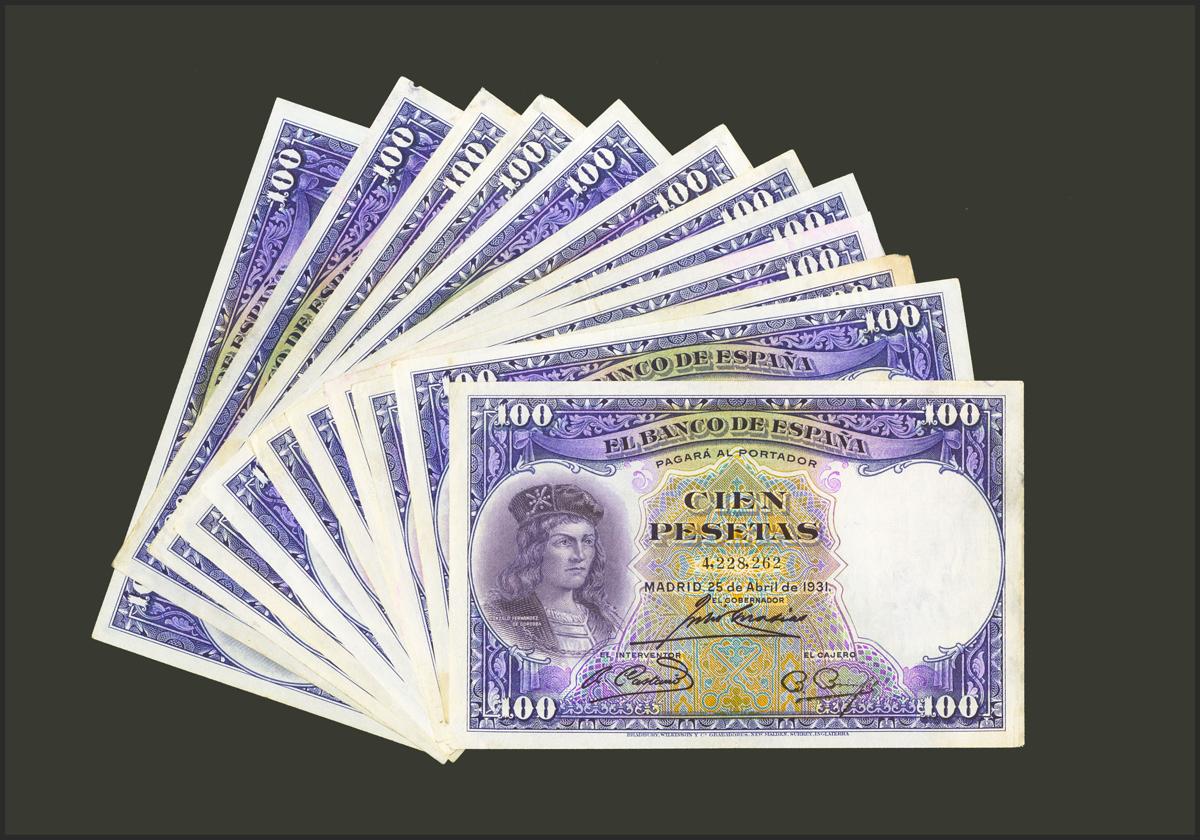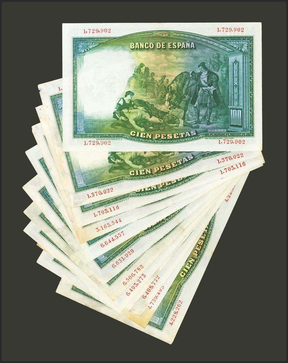 English Set of 12 100 Pesetas bills issued on April 25, 1931, without series. (Edifil 2021: 360). Extremely Fine/ Almost Very Fine. TO EXAMINE.