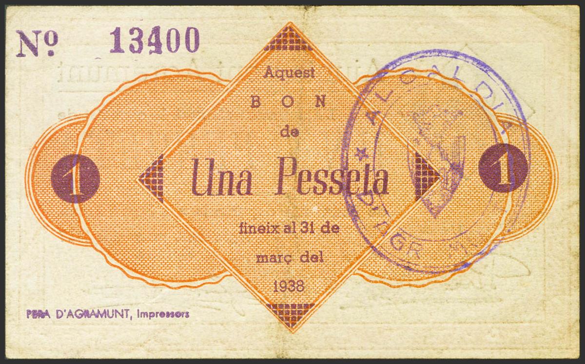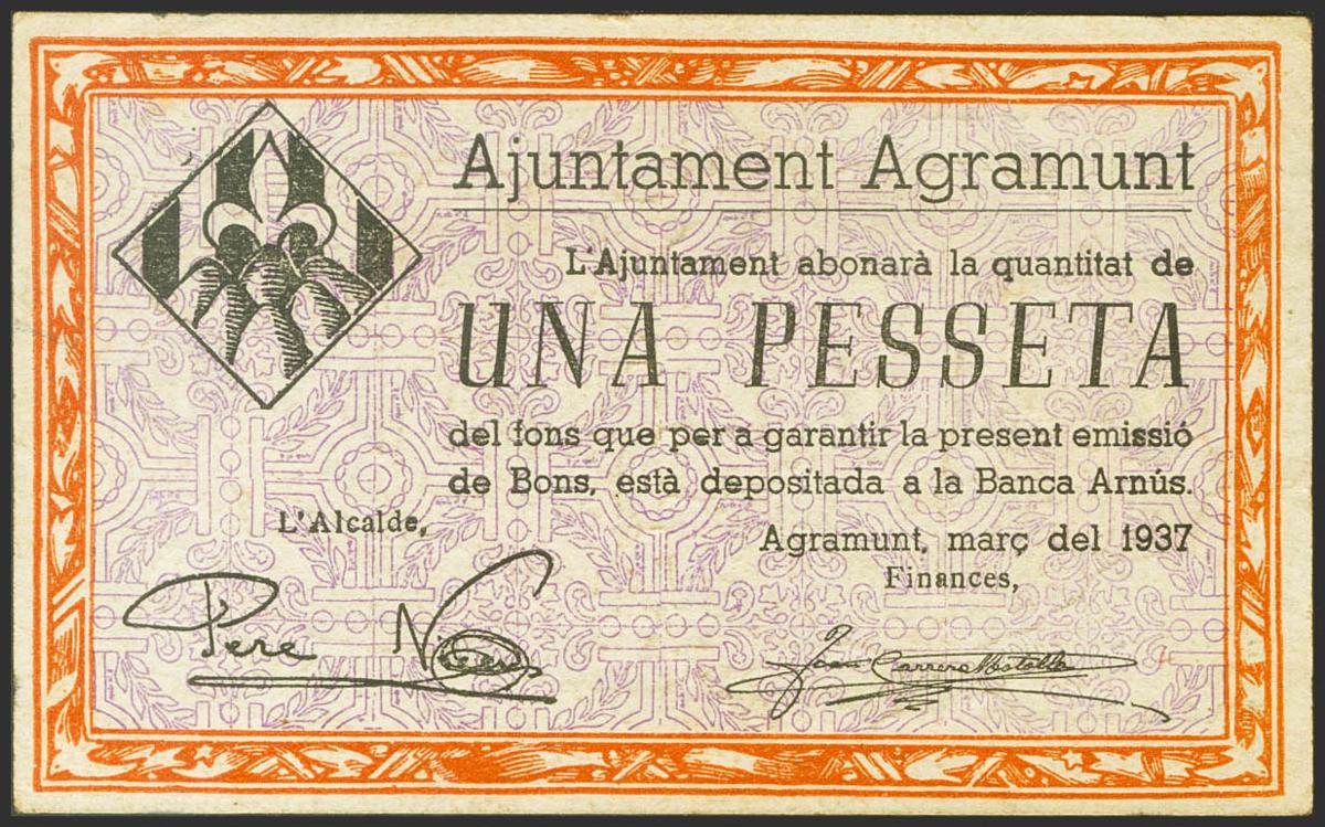 AGRAMUNT (LERIDA). 1 peseta. March 1937. (González: 6013). Extremely Fine.