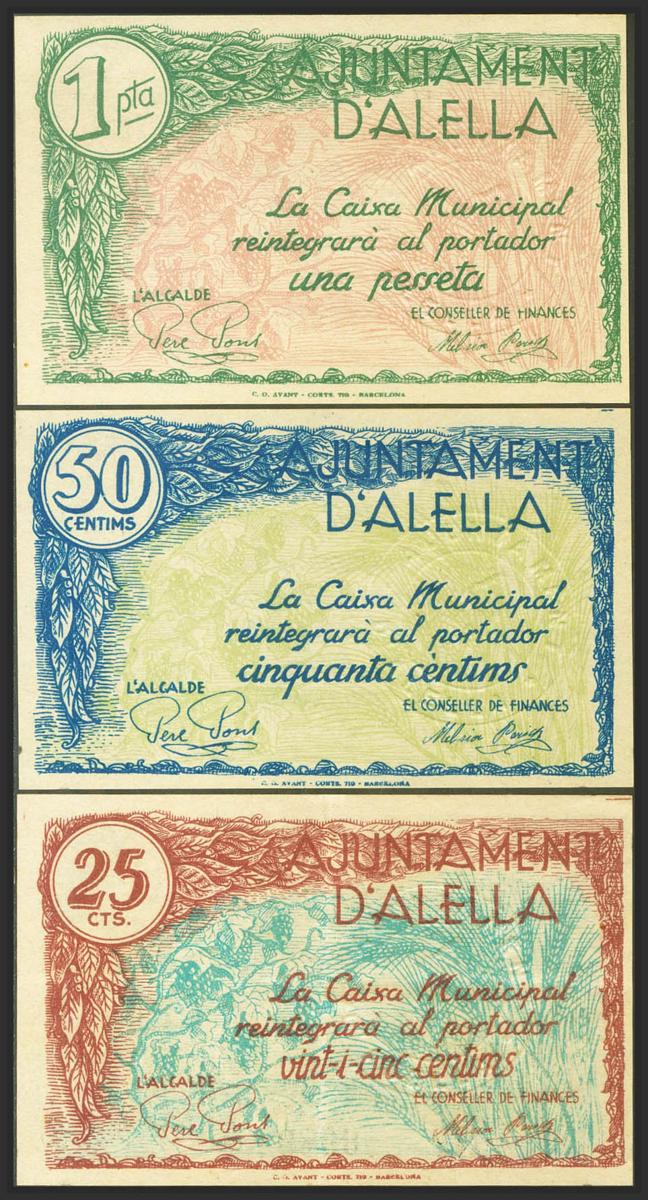 ALELLA (BARCELONA). 25 Cents, 50 Cents and 1 Peseta. (1937ca). (González: 6158/60). Complete series. Almost Uncirculated/ Good Extremely Fine.