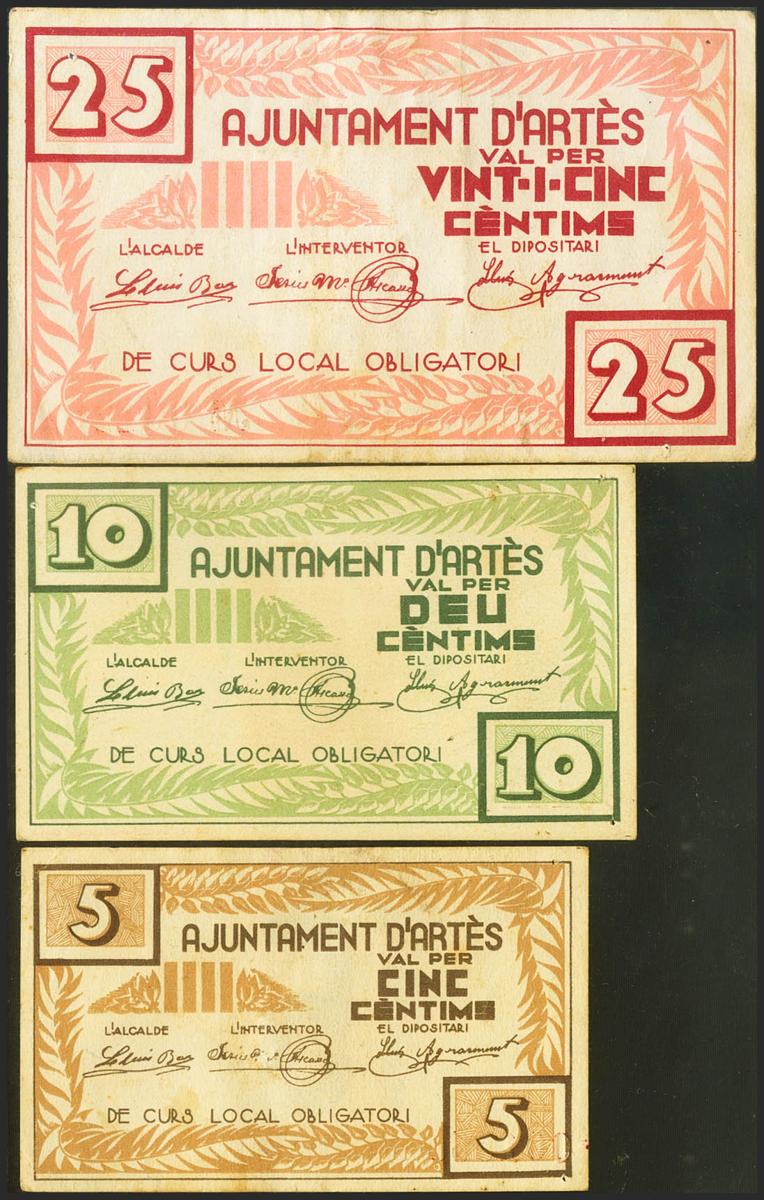ARTS (BARCELONA). 5 Cents, 10 Cents and 25 Cents. (1937ca). (González: 6413/15). Complete series. Good Very Fine.