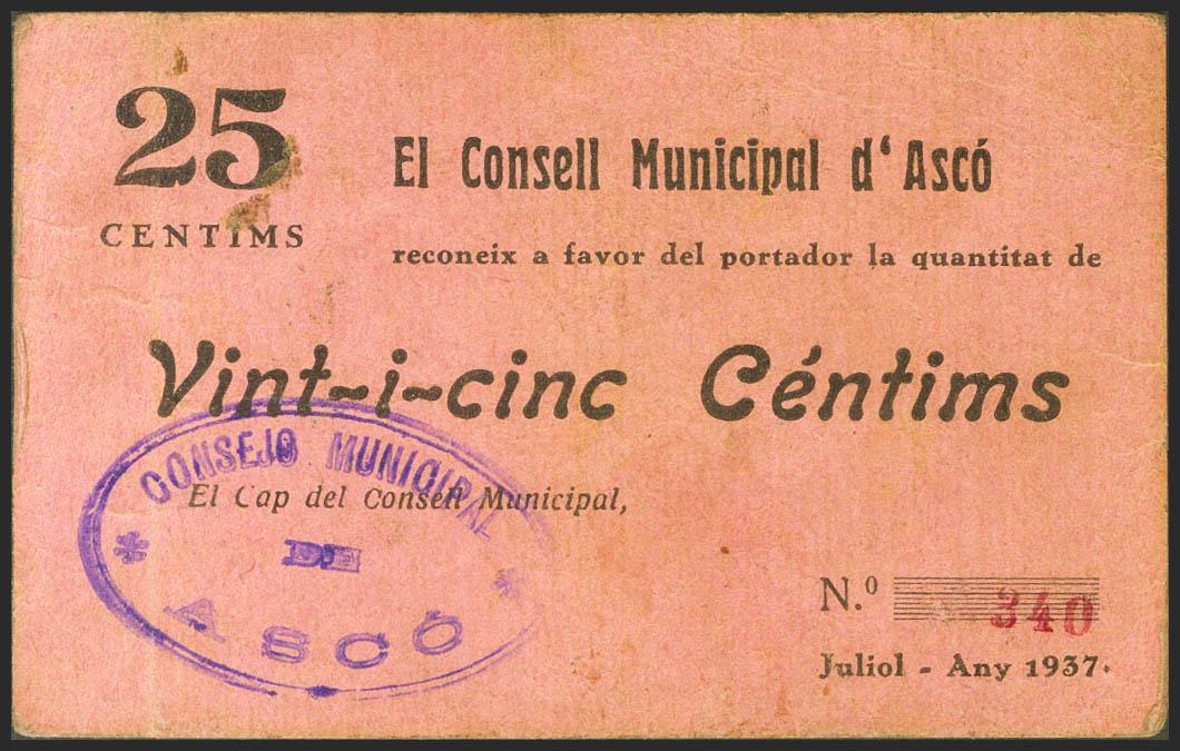 ASCO (TARRAGONA). 25 cents. July 1937. (González: 6436). Good Very Fine.