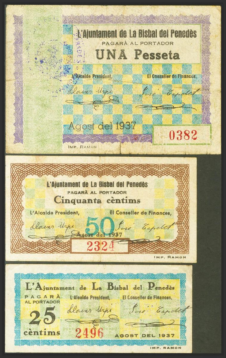 LA BISBAL DEL PENEDES (TARRAGONA). 25 Cents, 50 Cents and 1 Peseta. August 1937. (González: 7094/96). Rare complete series. Almost Very Fine/ Very Fine.