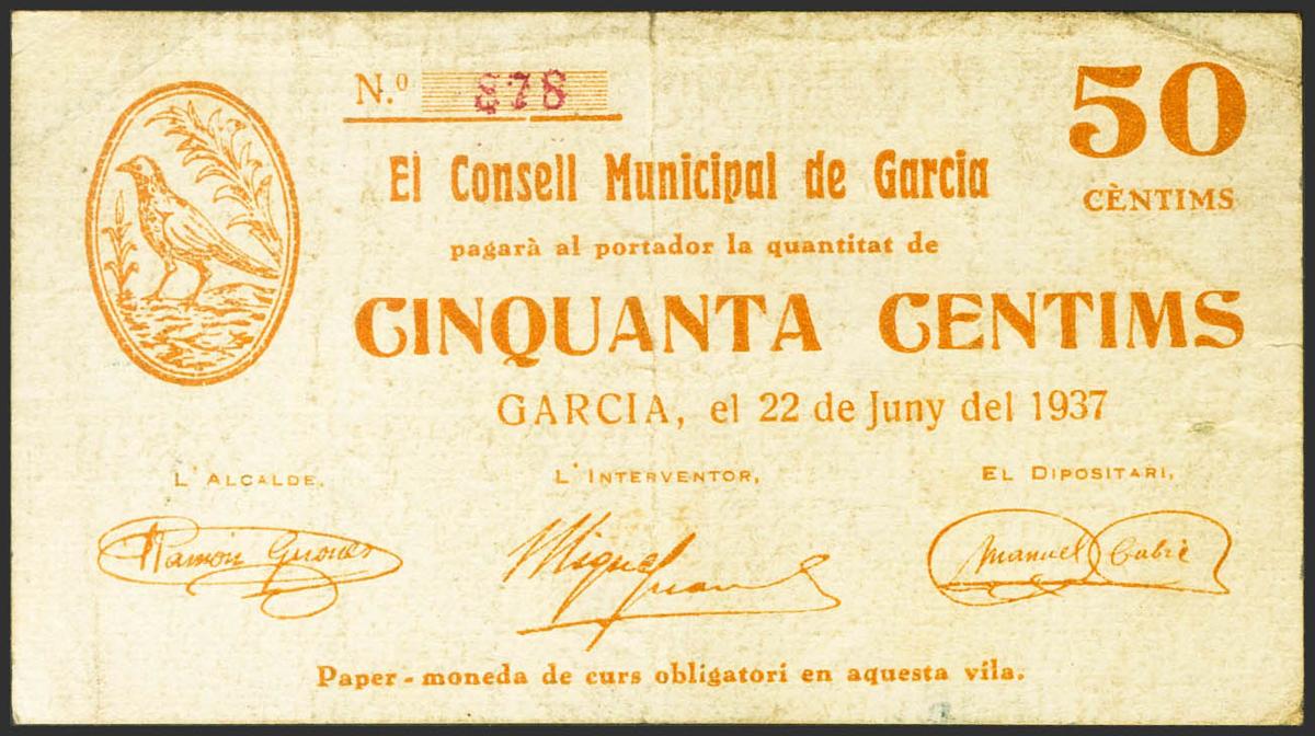 GARCIA (TARRAGONA). 50 cents. June 22, 1937. (González: 7969). Very rare. Very Fine.