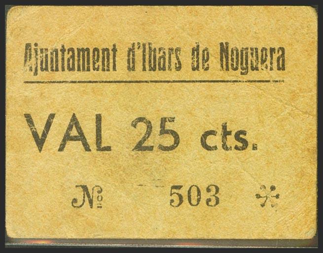 IBARS DE NOGUERA (LERIDA). 25 cents. (1937ca). (Gonzalez: 8240). Almost Extremely Fine.