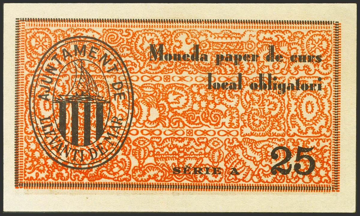 English LLEVANTI DE MAR (BARCELONA). 25 cents. November 1937. Series A. (González: 8398). Unusual. Almost Uncirculated.