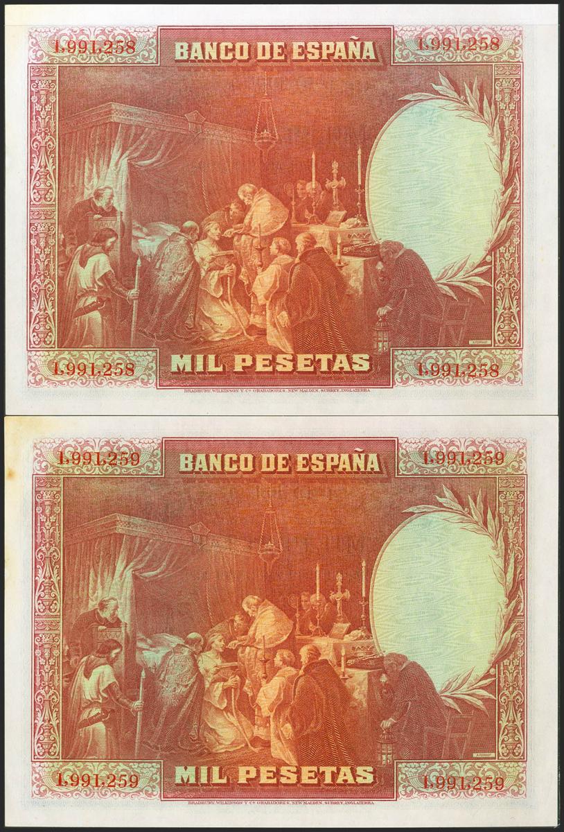 1000 pesetas. August 15, 1928. Correlative couple. No serie. (Edifil 2017: 357). Rust spots, retains all its original size. Almost Uncirculated.
