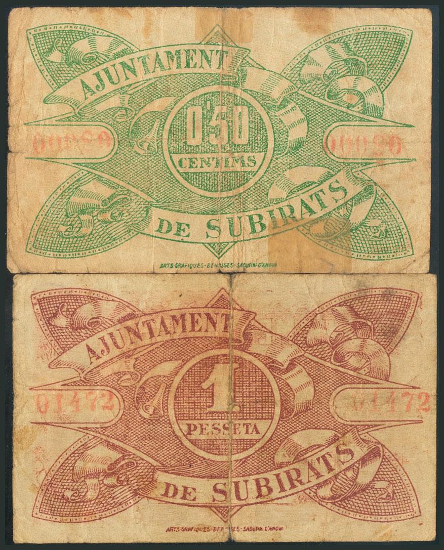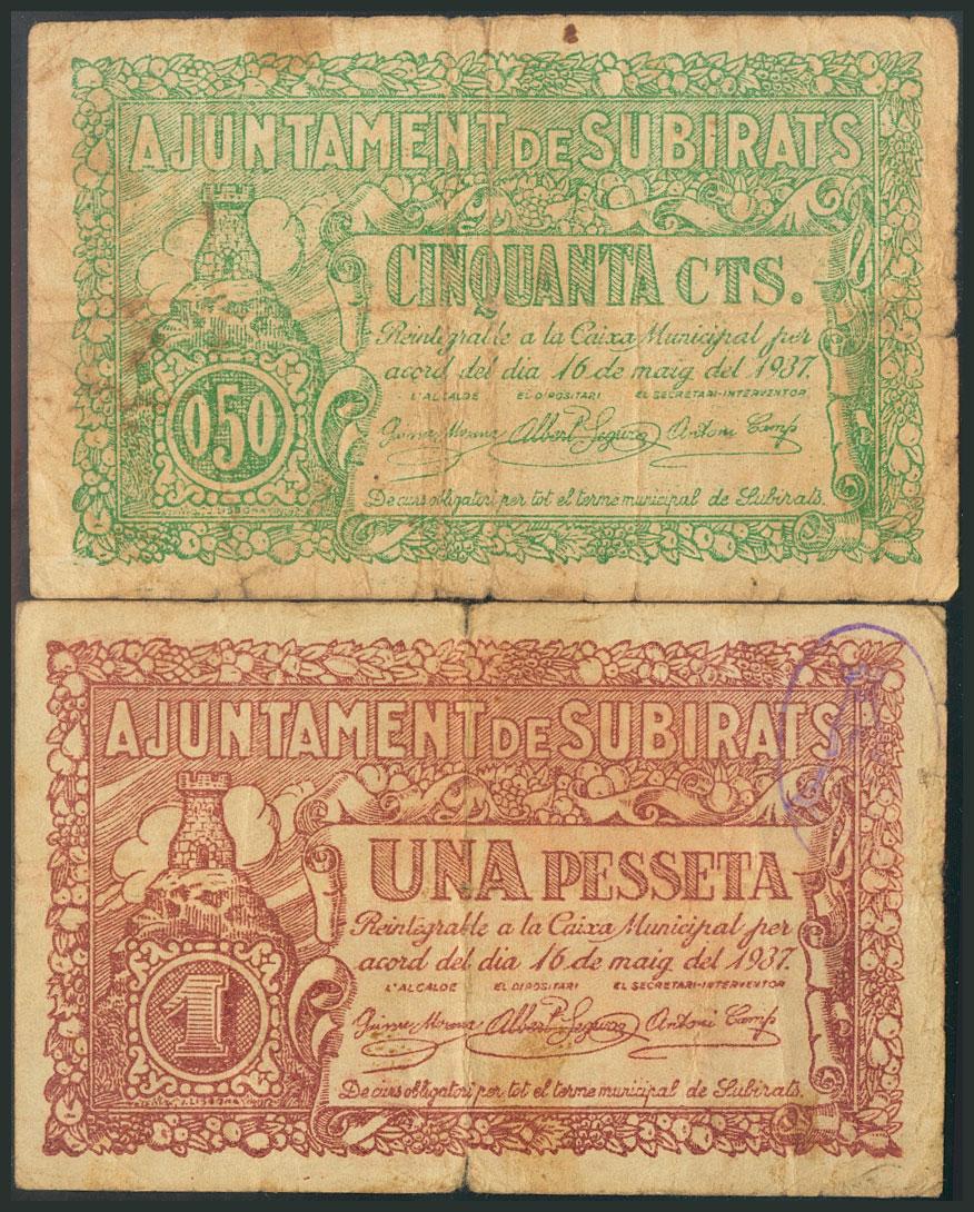 SUBIRATS (BARCELONA). 50 Cents and 1 Peseta. May 16, 1937. (González: 10056/57). rare. Fine.
